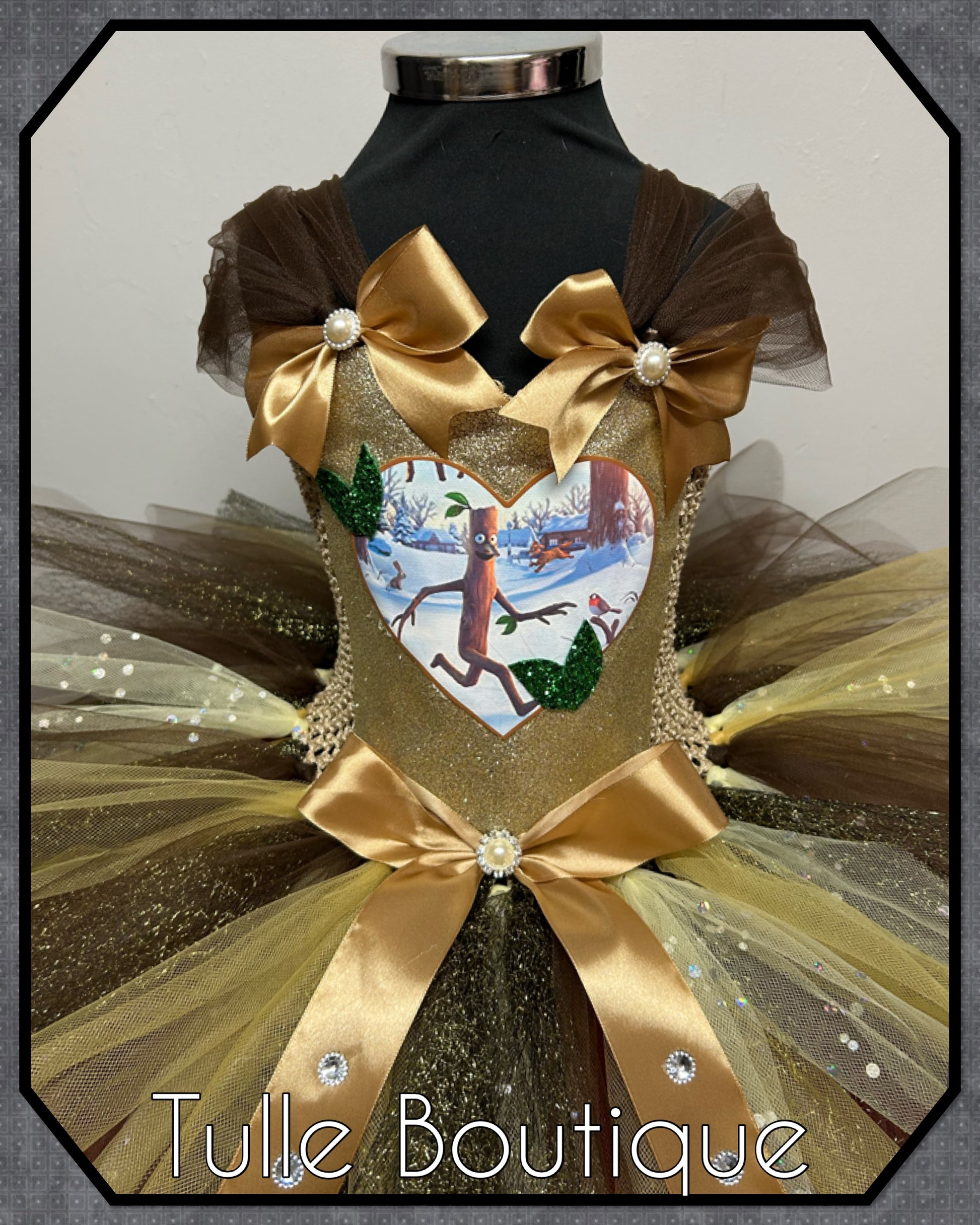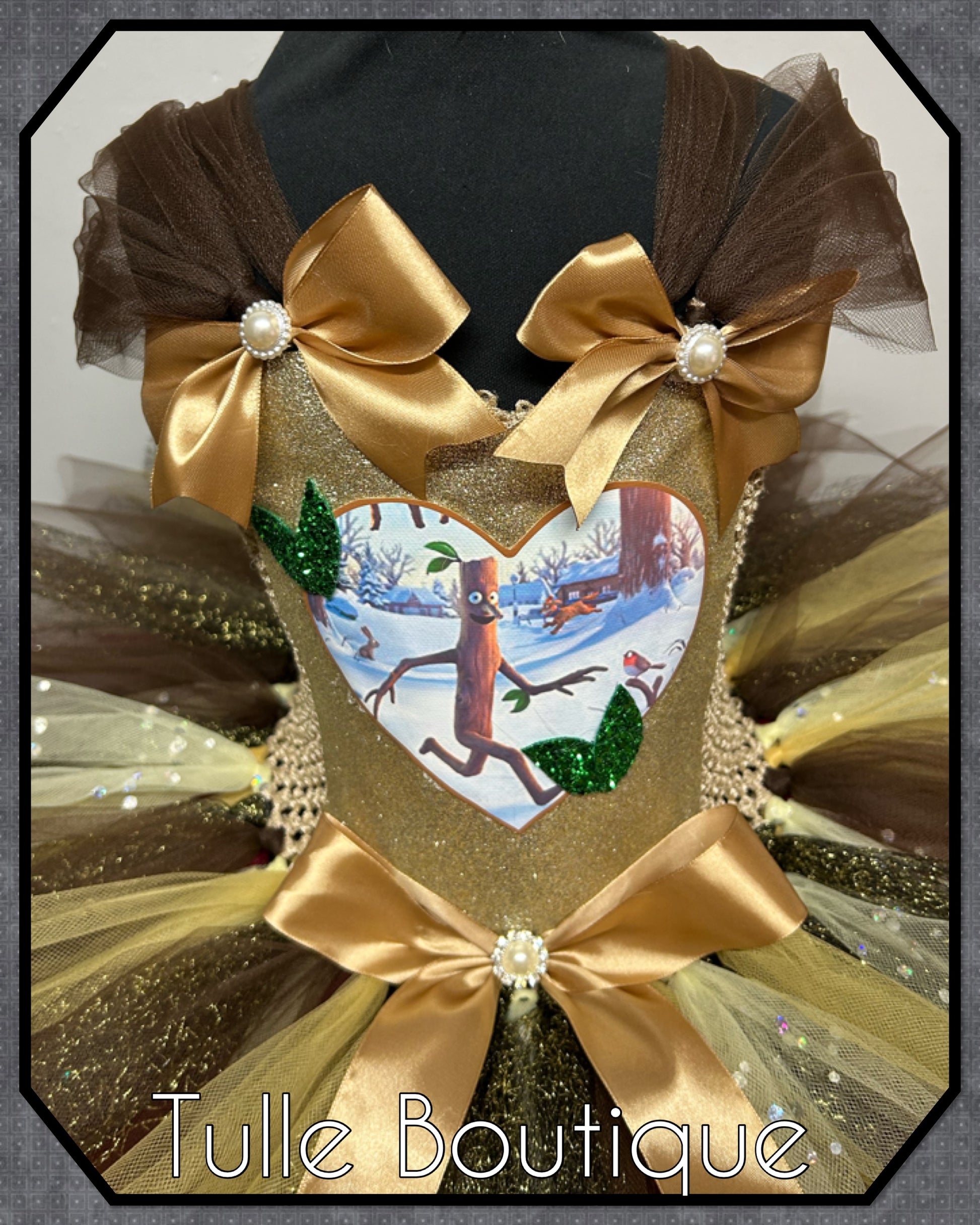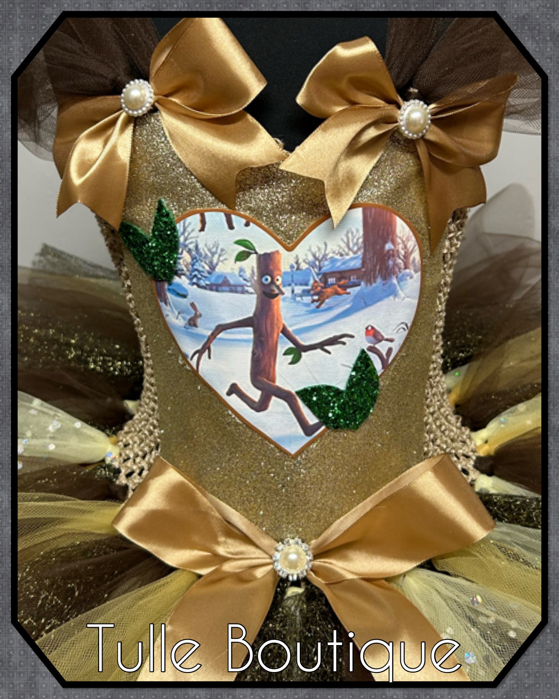 Featuring a glitter front with picture patch, satin bows on the waist.
