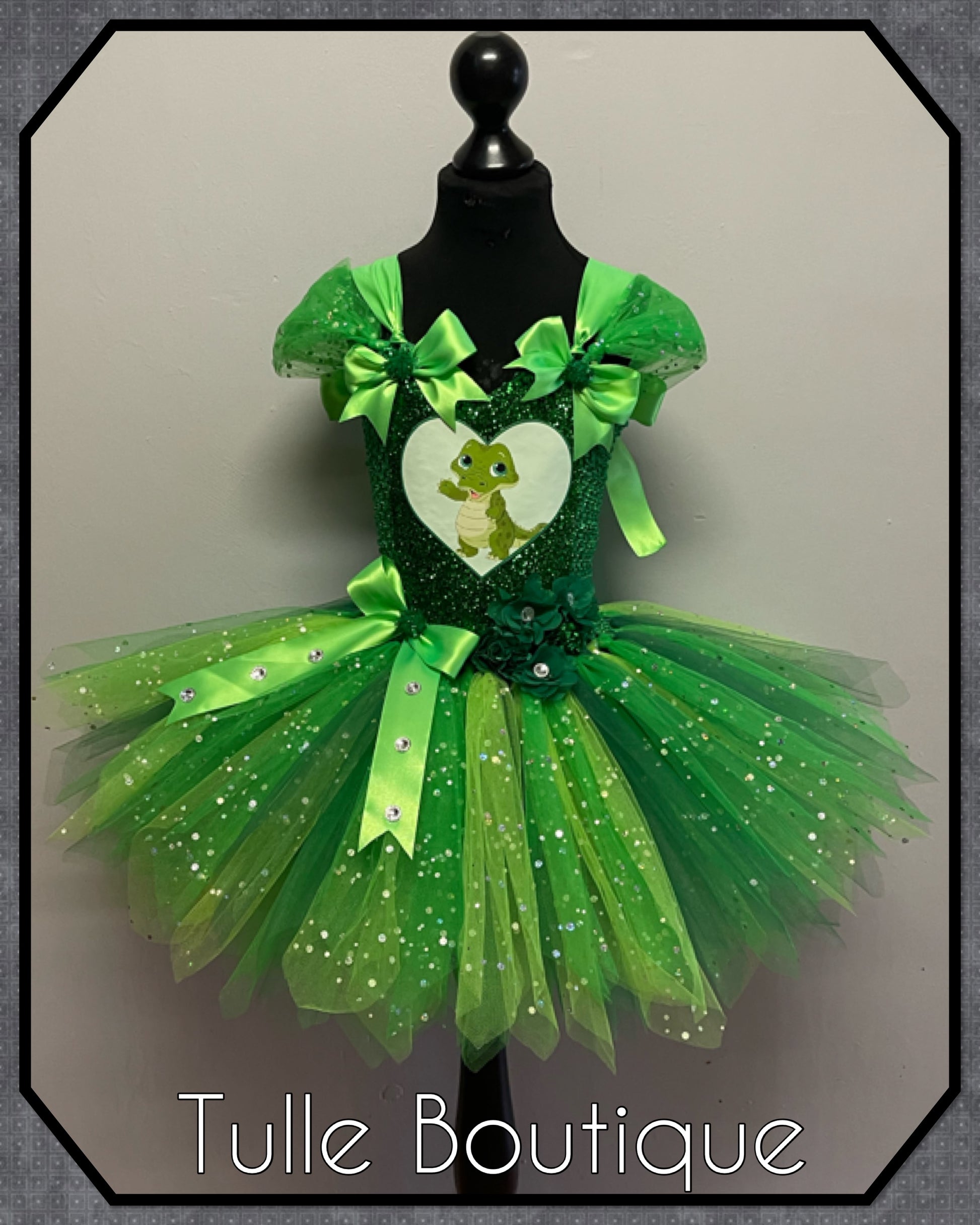 Featuring a glitter front with picture patch, bows with rhinestone embellishments and flowers to the waist.