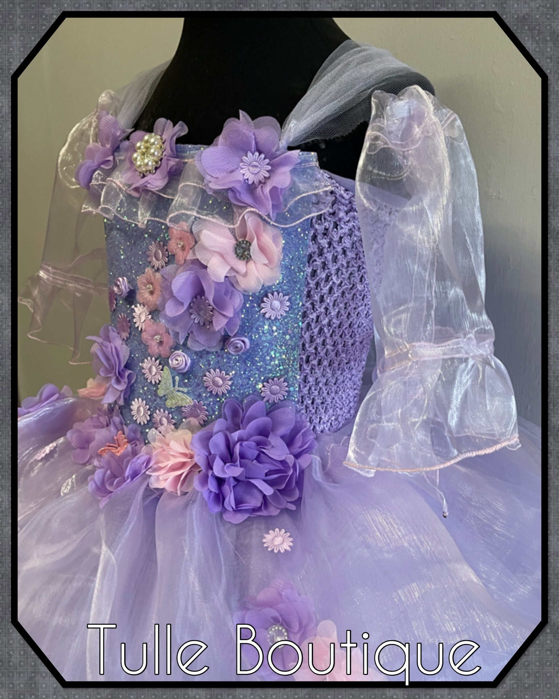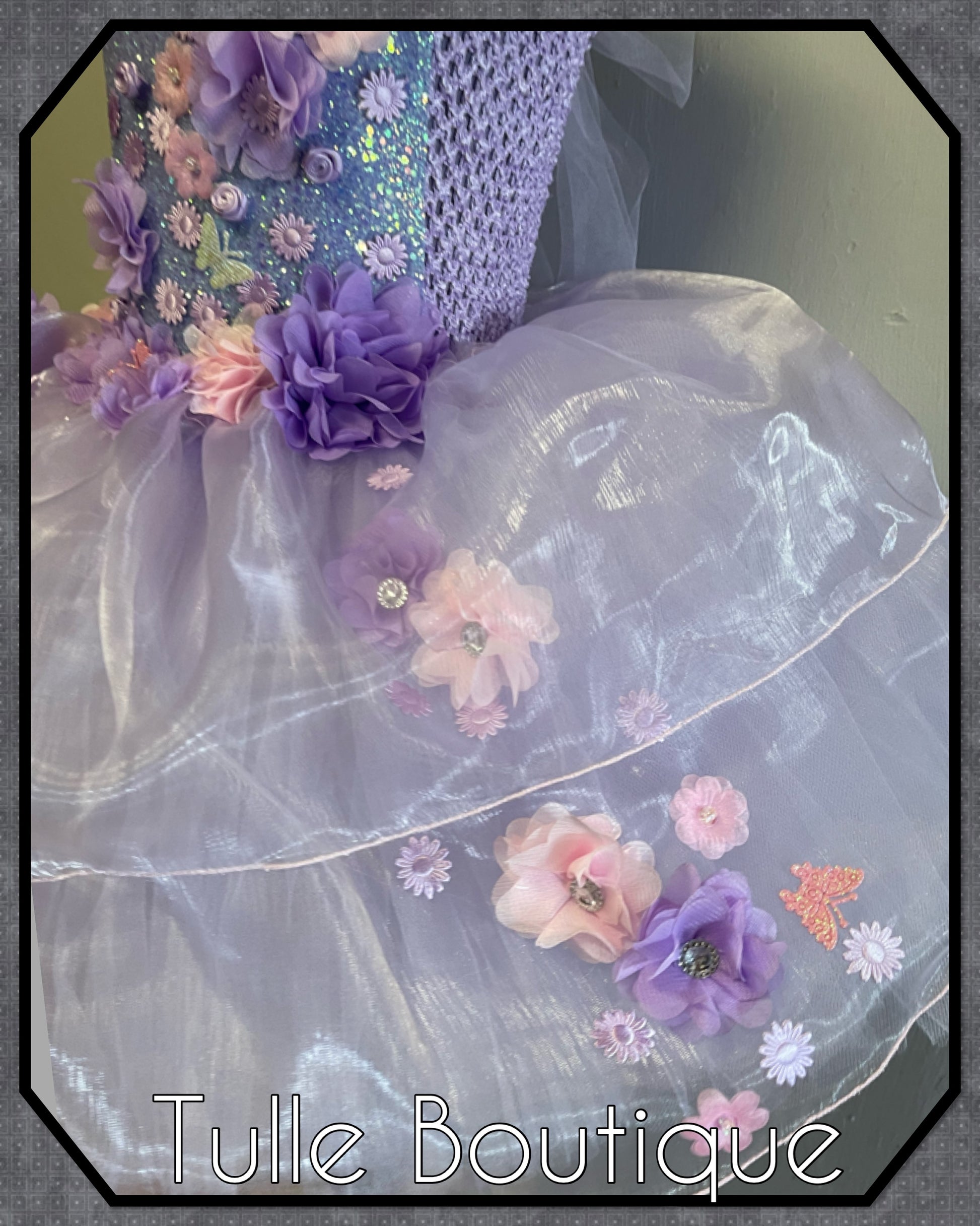Featuring a glitter front with flowers and rhinestones cascading into the skirt. The organza over layer gives this dress a truly magical feel.