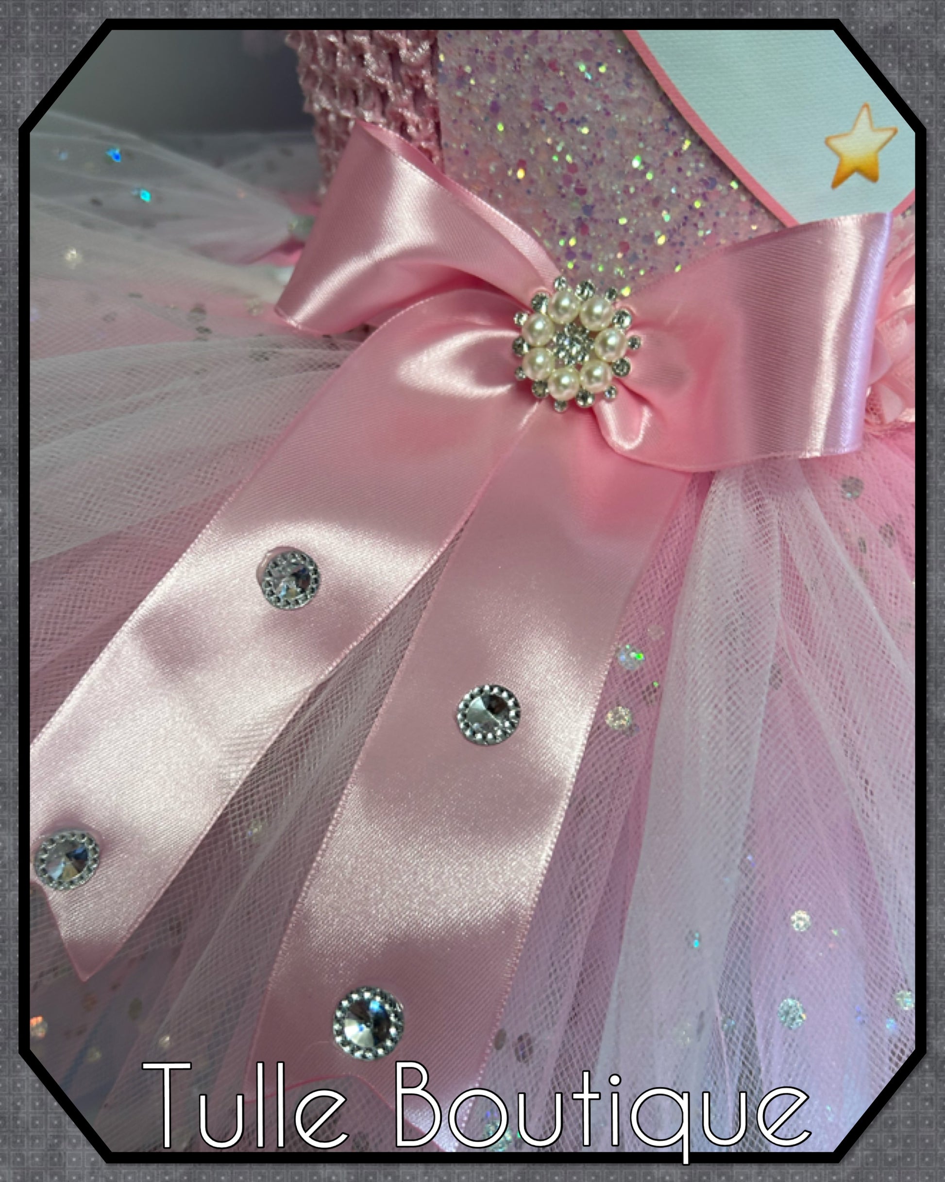 Featuring a glitter front with picture patch, flowers and bow waist.