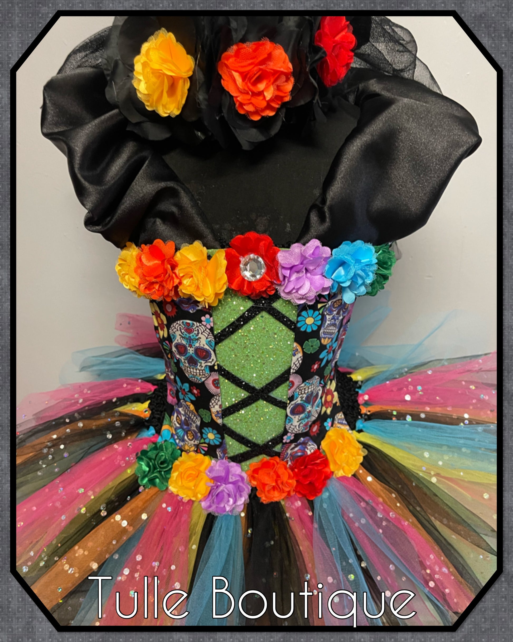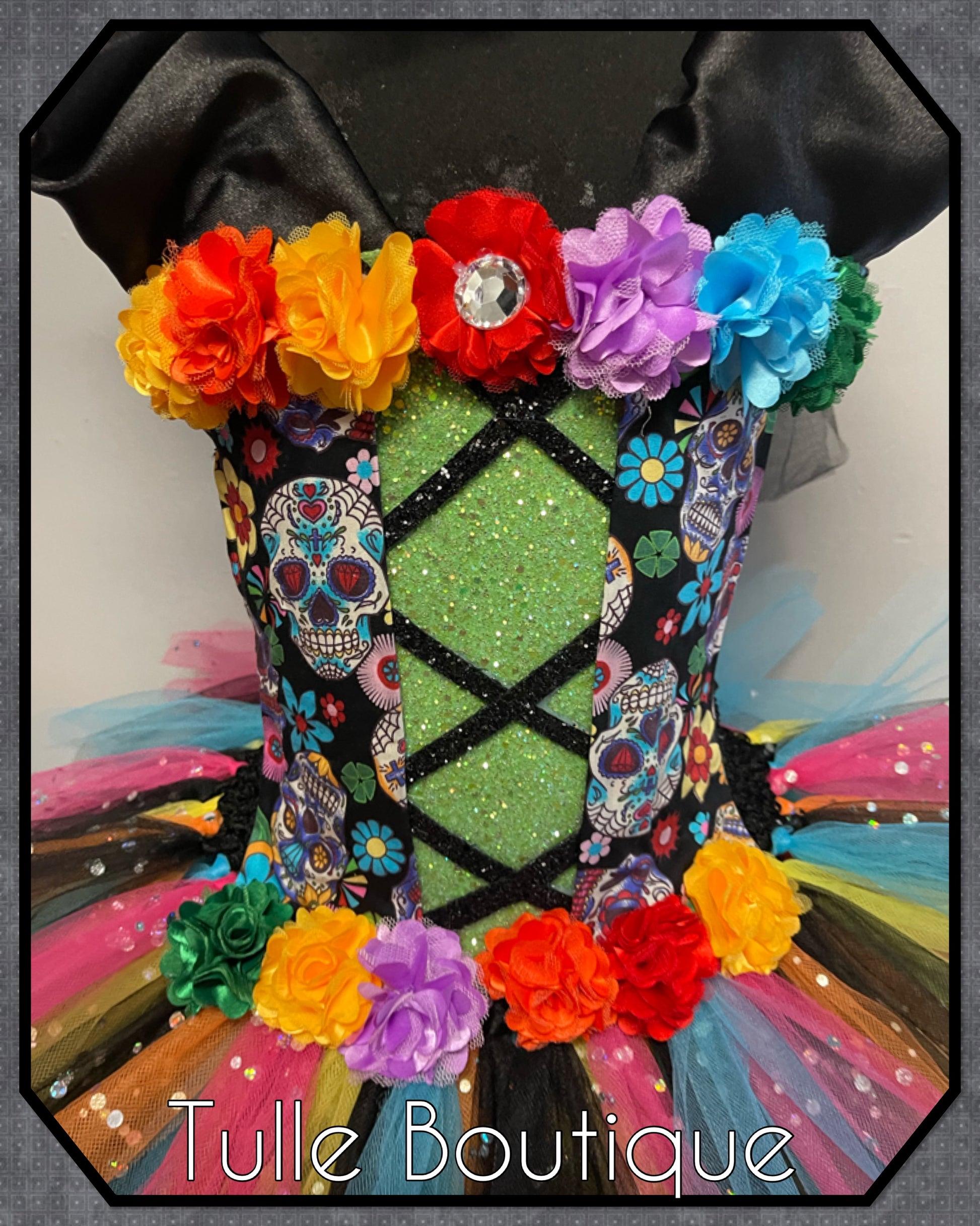 Featuring a glitter front with corset detail and sugar skull fabric with flowers on the waist.
