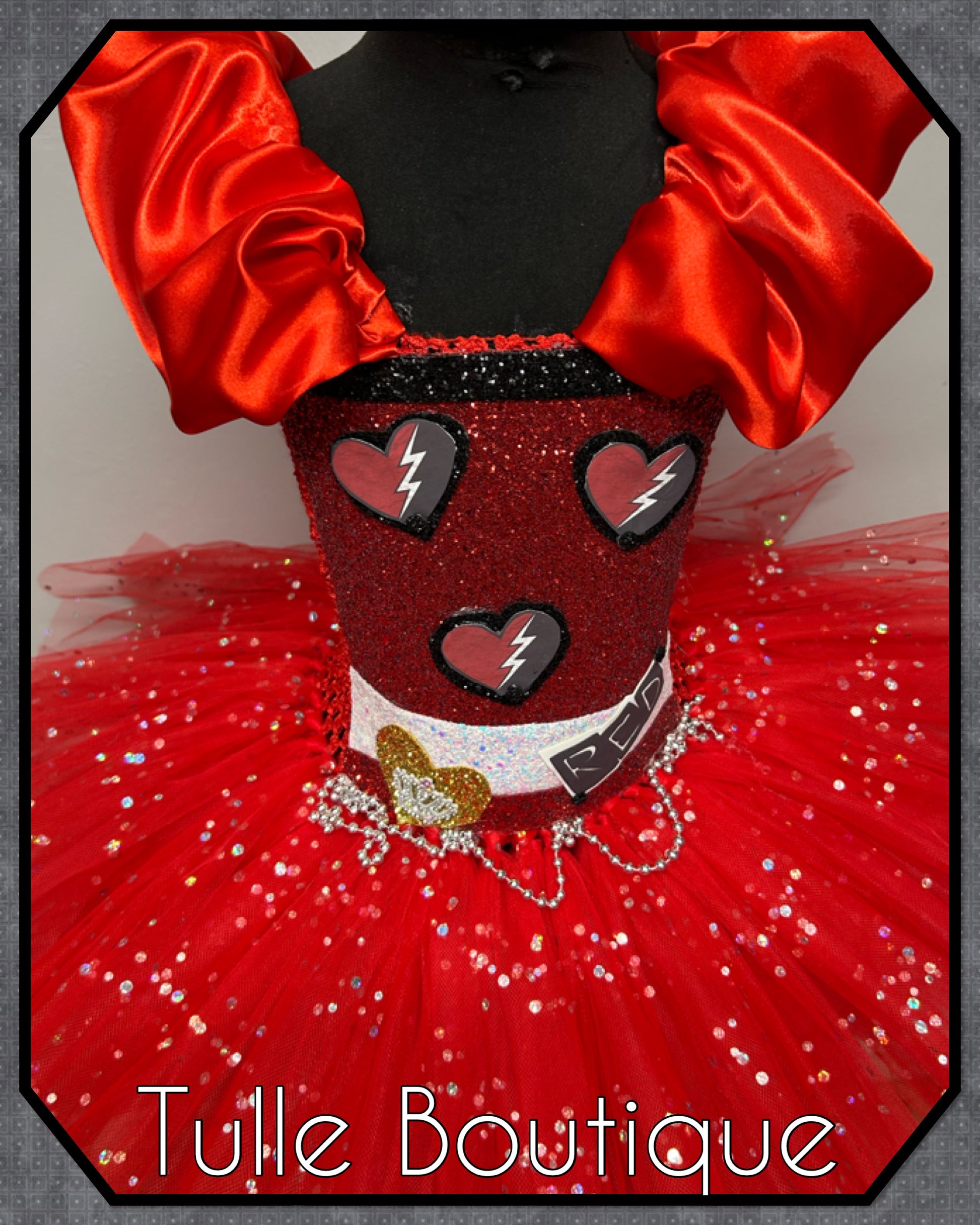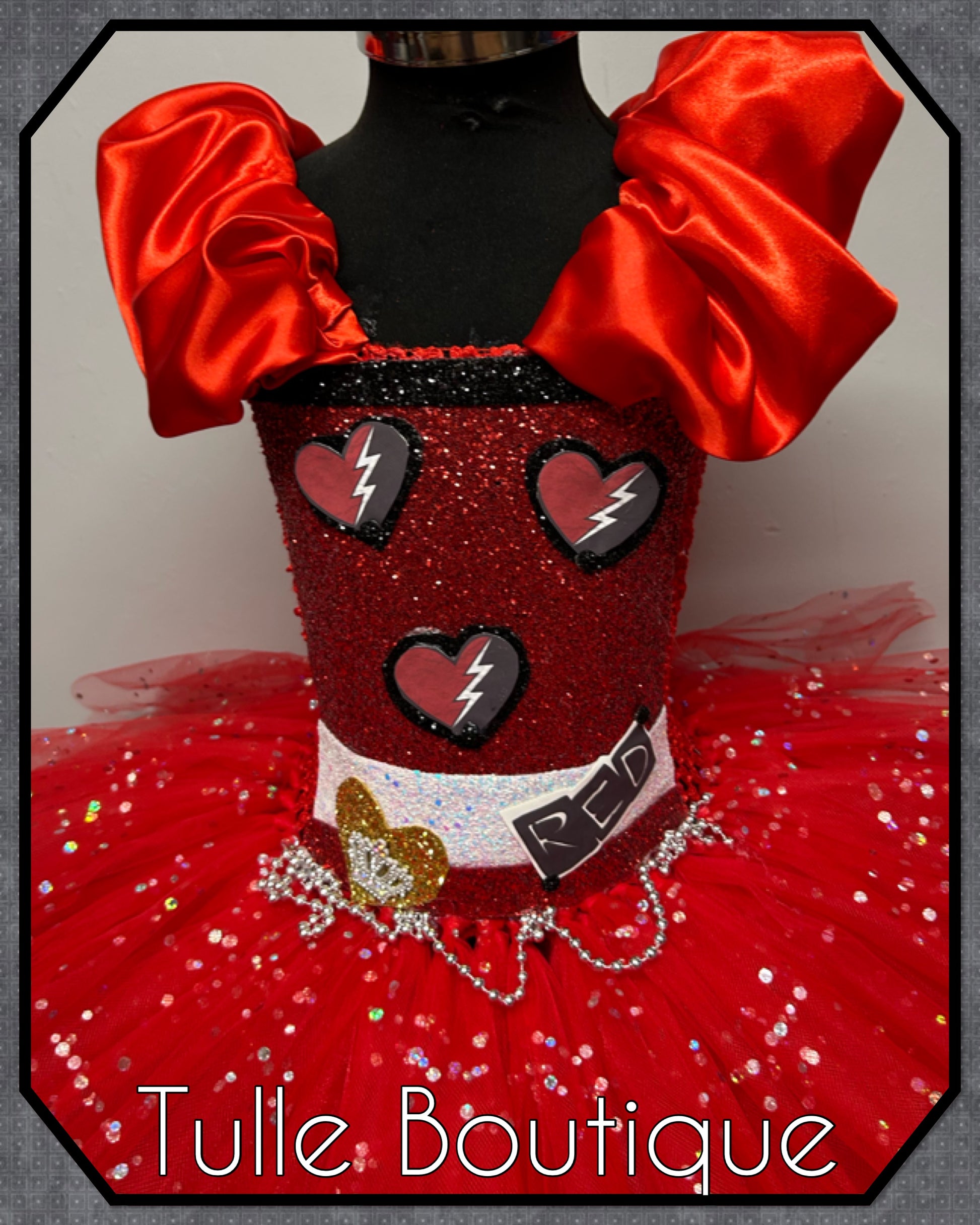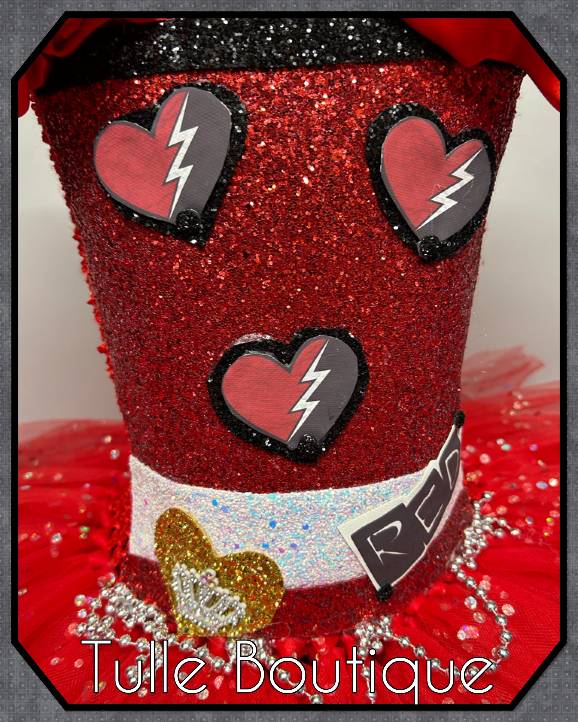 Featuring a glitter front with red heart and crown detail.