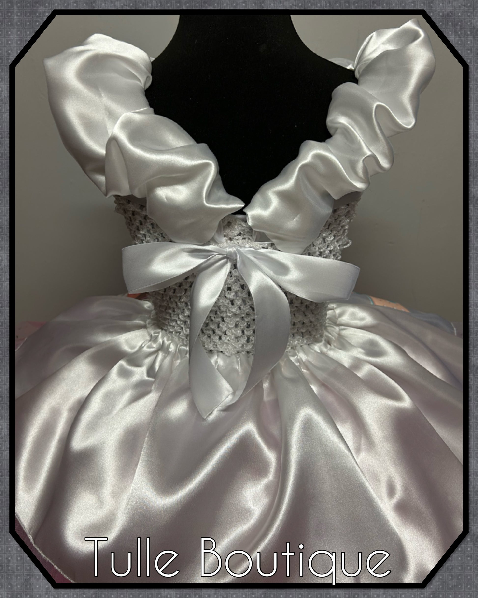 Each tutu is hand tied onto the crochet top with two double layers for extra volume and fullness so it is not see through, with a satin overlayer featuring picture appliqué for a truly magical effect.