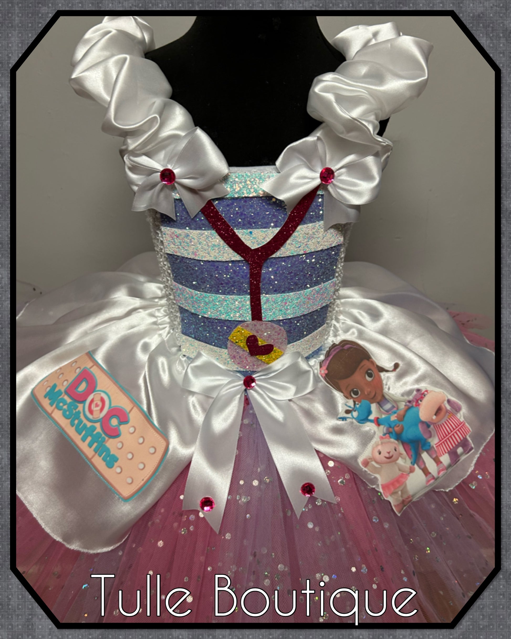 Featuring a glitter front to mimic her doctor outfit finished with satin bows and crystals.
