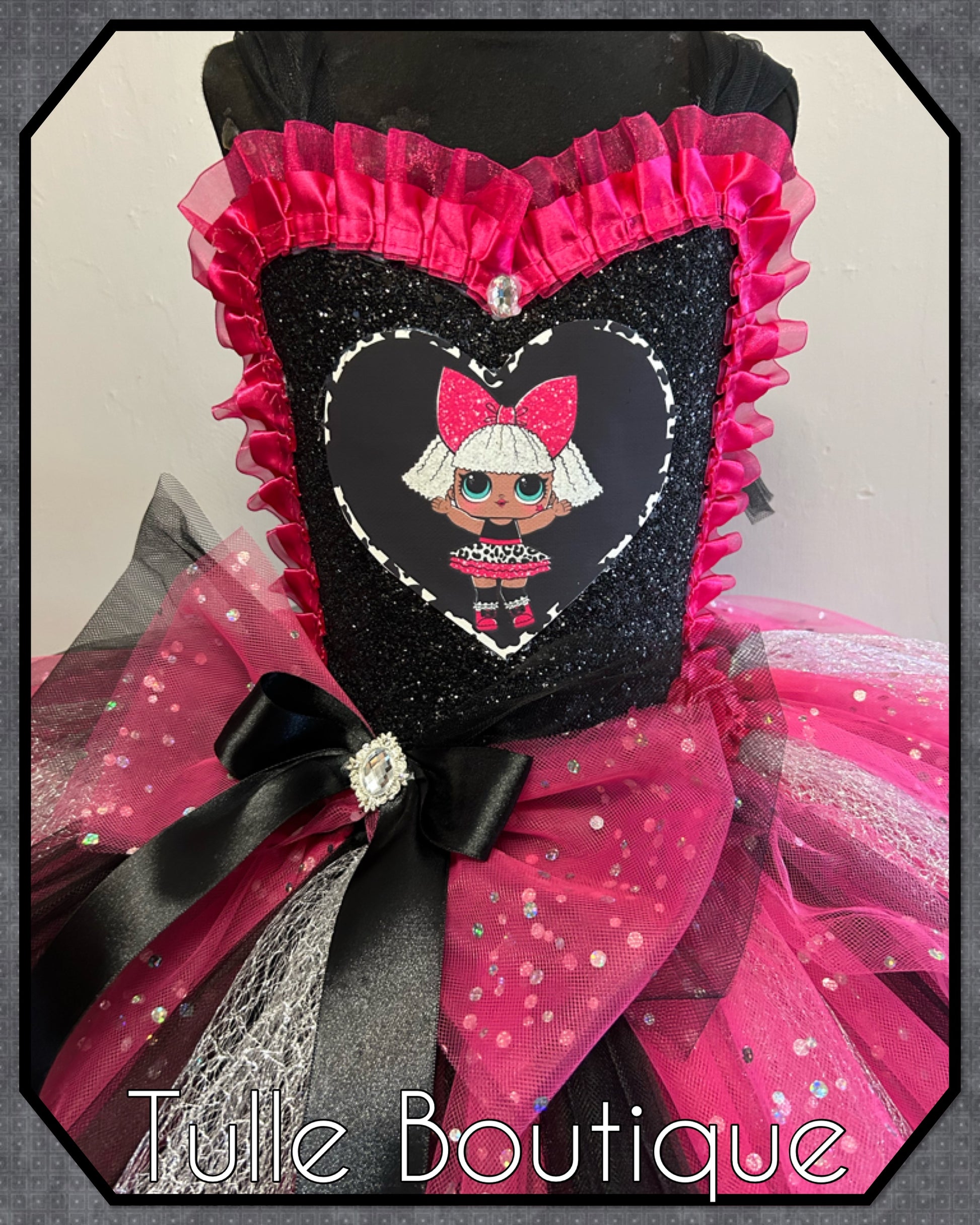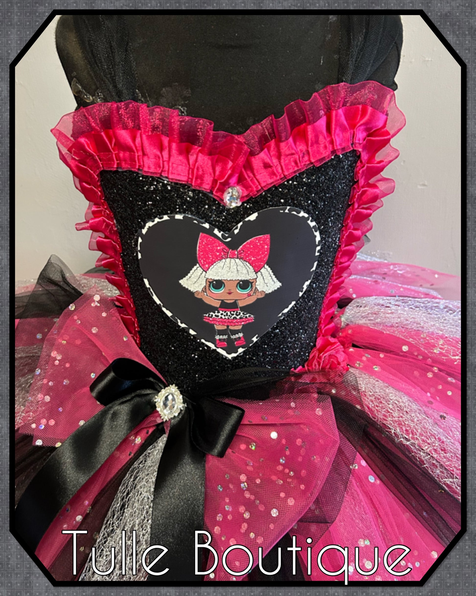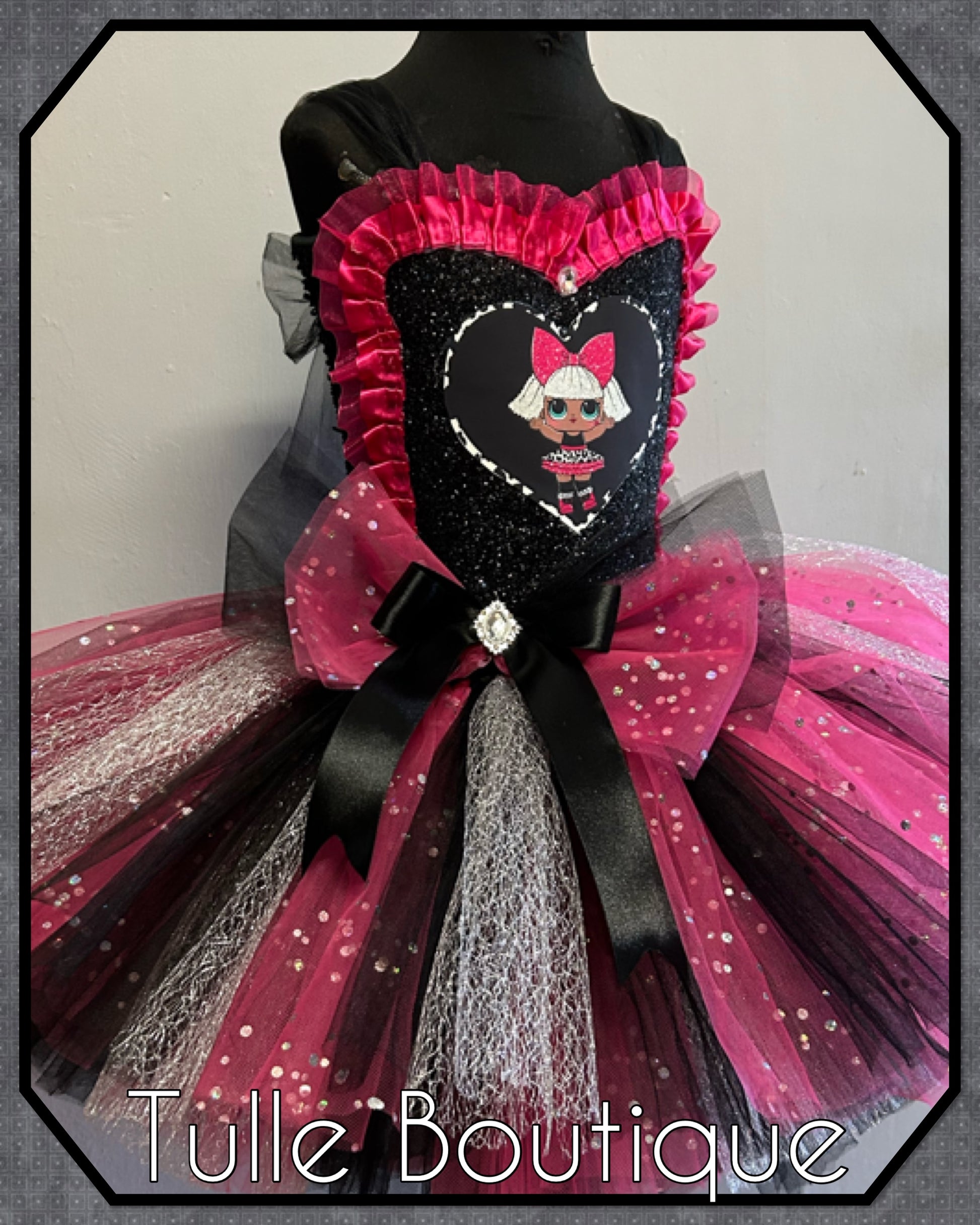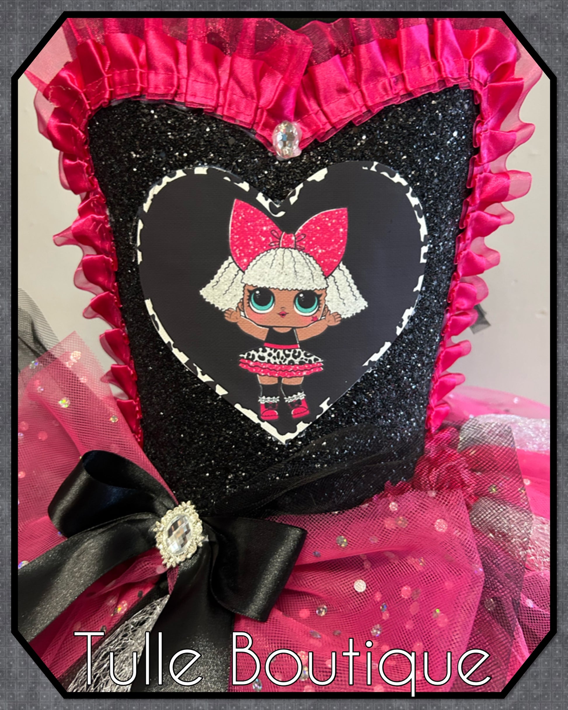 Featuring a glitter front with satin trim and heart picture patch. Finished with a large bow on the waist.