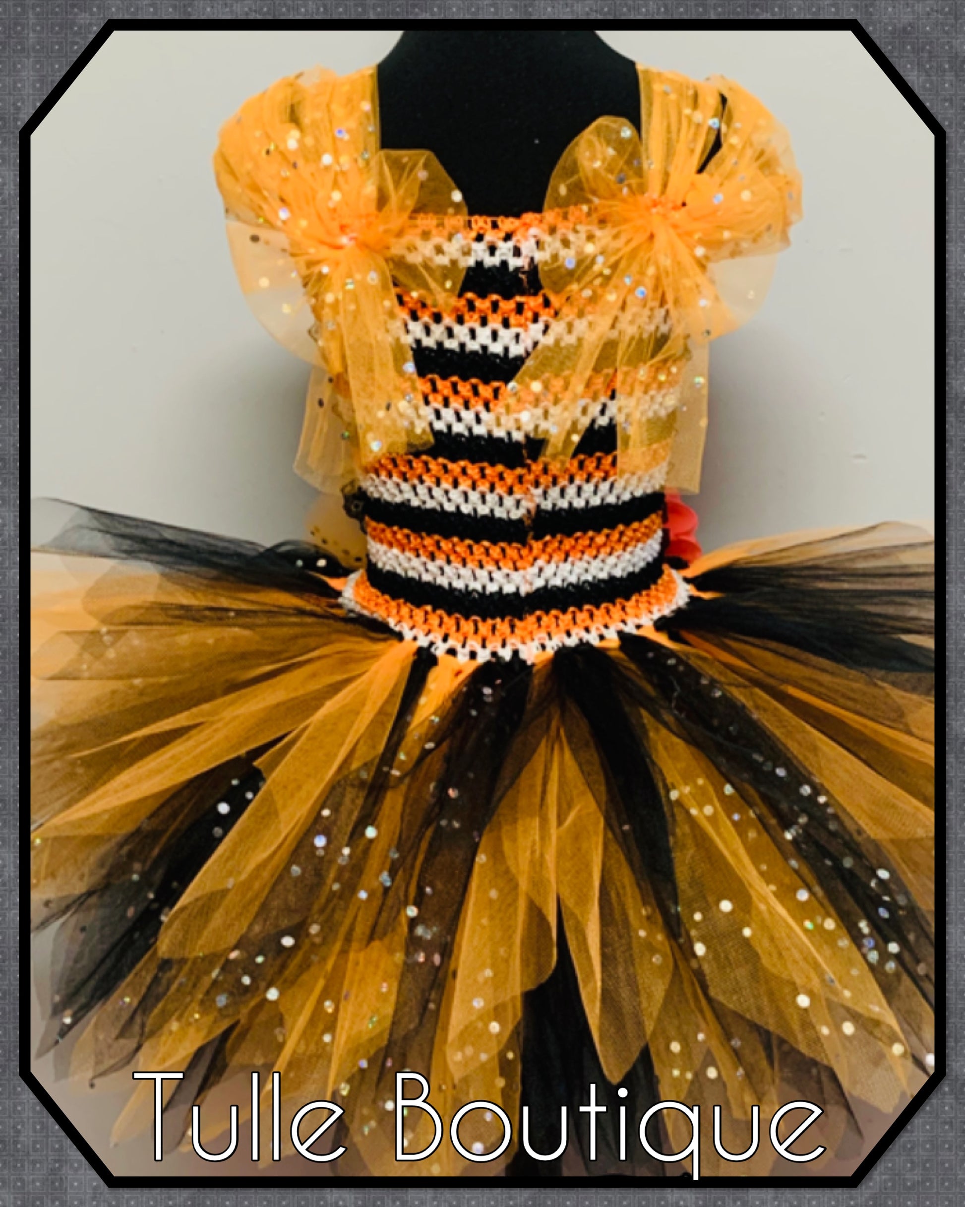 Each tutu is hand tied onto the crochet top with three double layers for extra volume and fullness so it is not see through with glitter detailing to the top layer.
