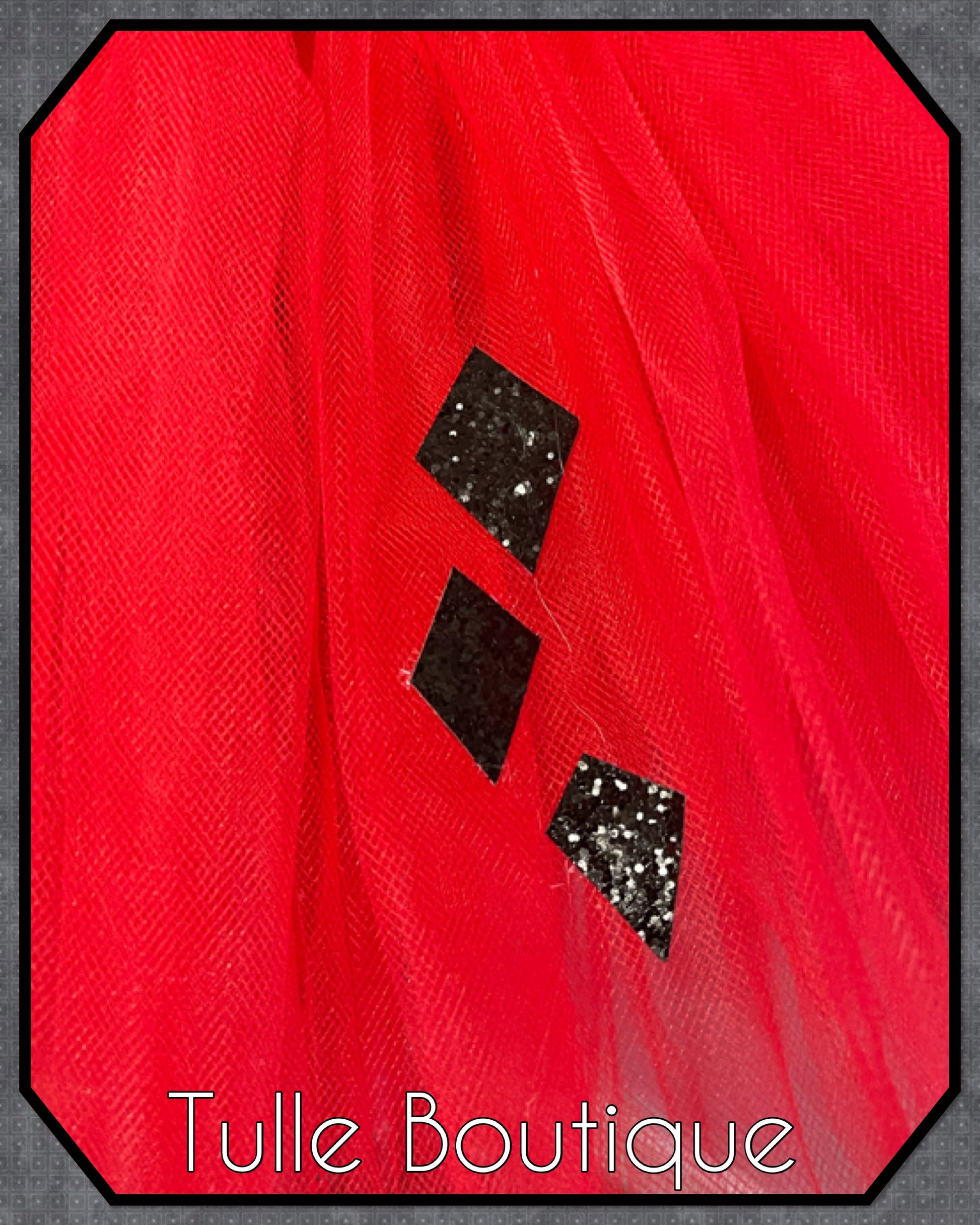 Each tutu is hand tied onto the crochet top with three double layers for extra volume and fullness so it is not see through with the Harley Quinn logo on the hem.