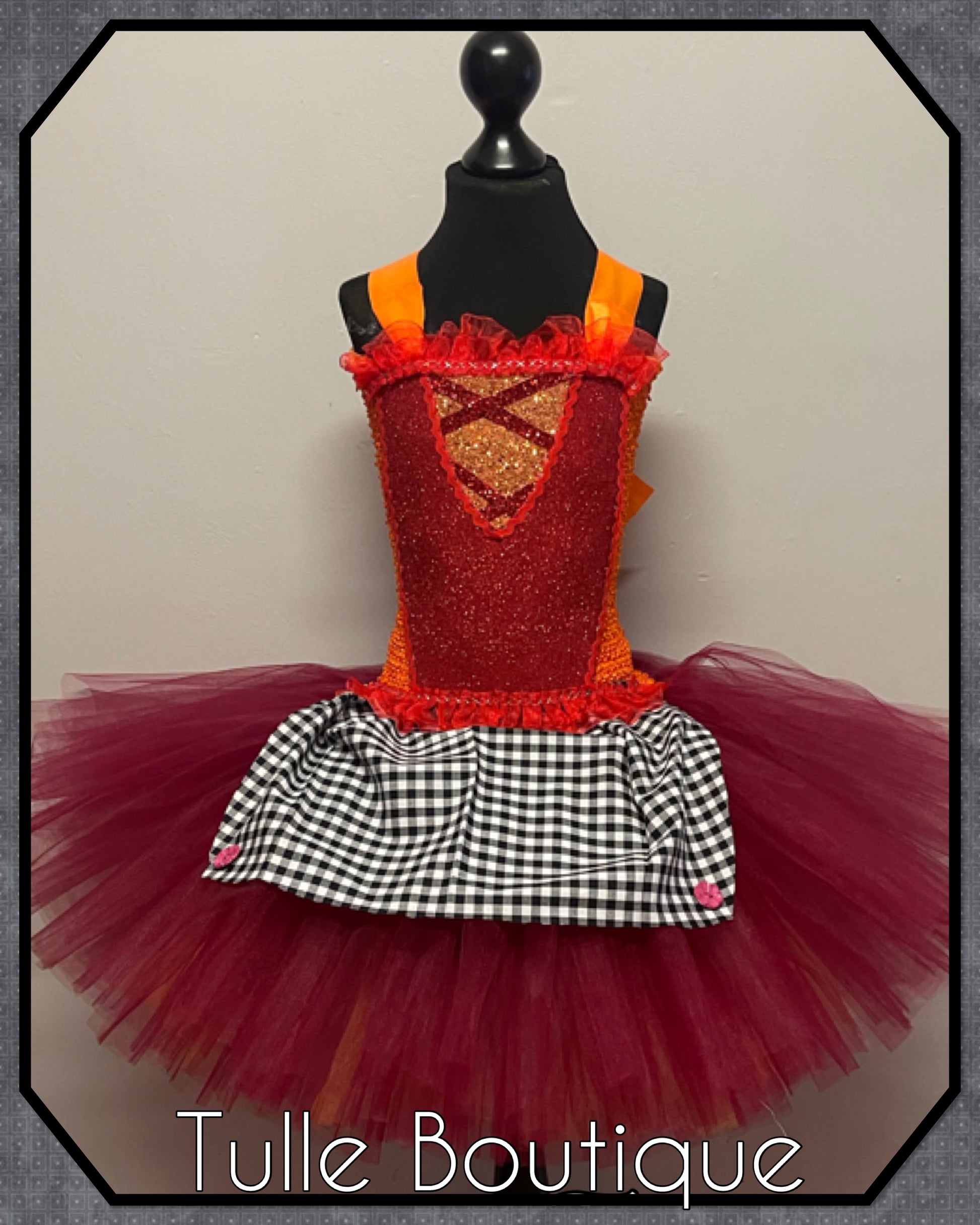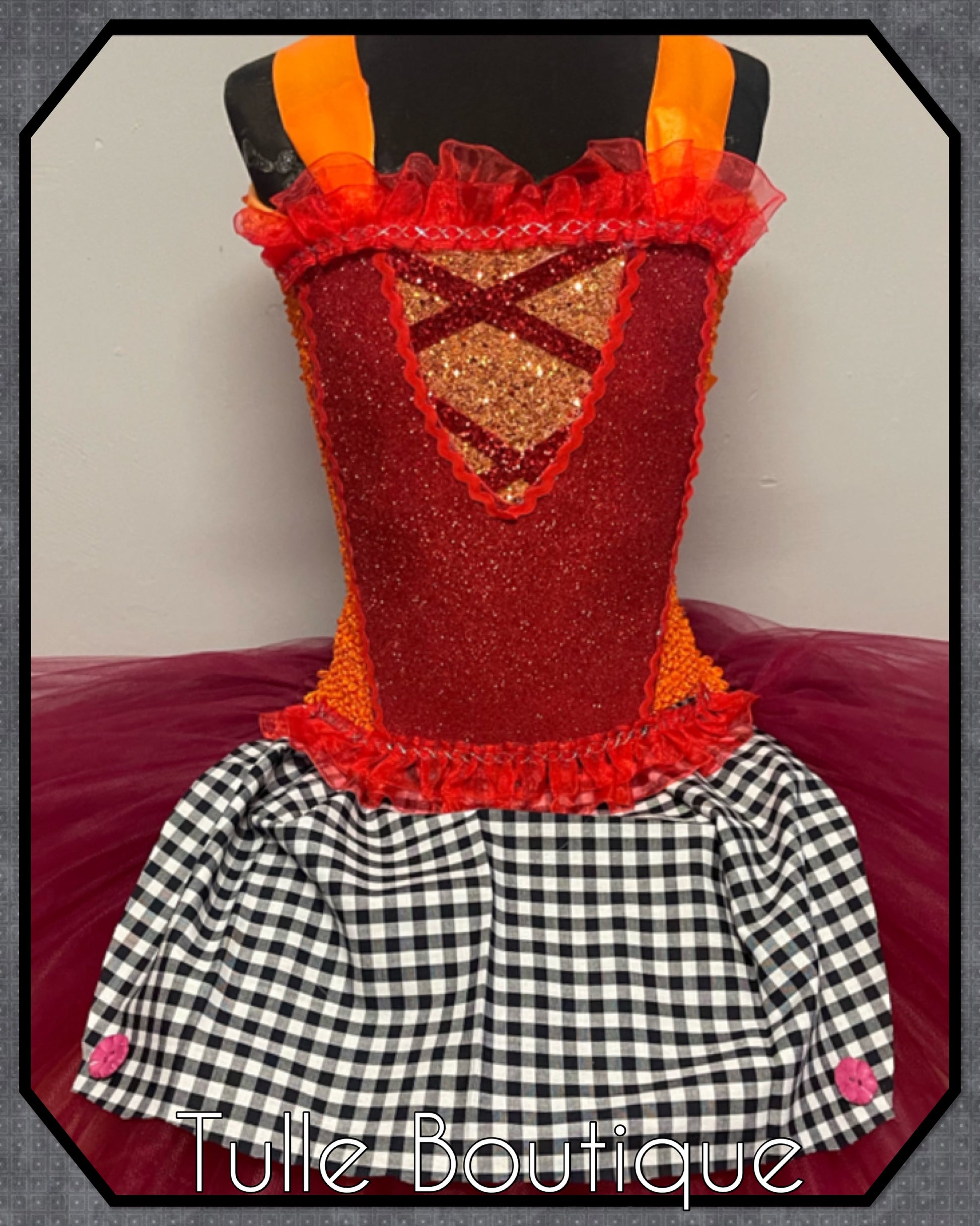 Featuring a glitter front with ribbon detail and apron front.