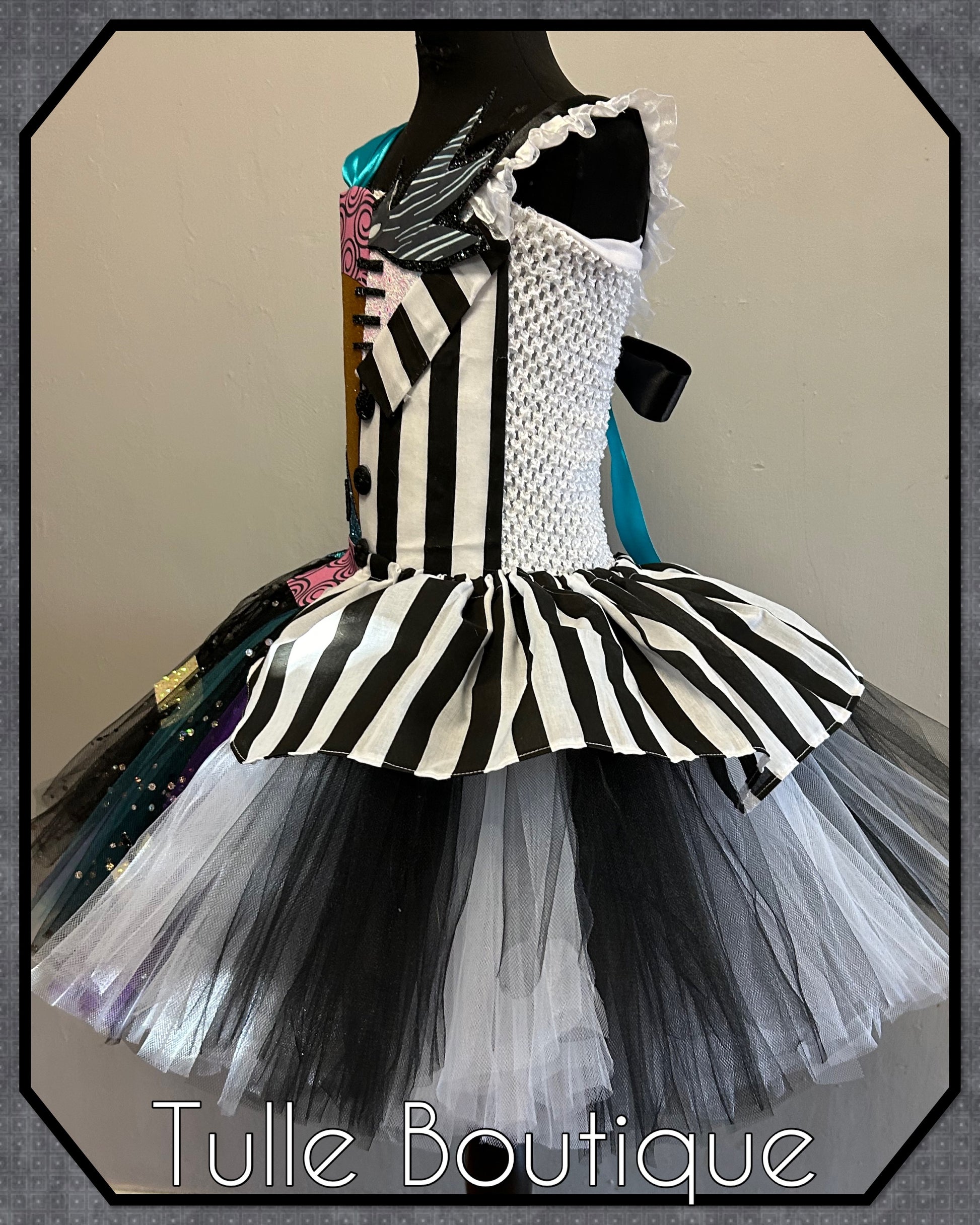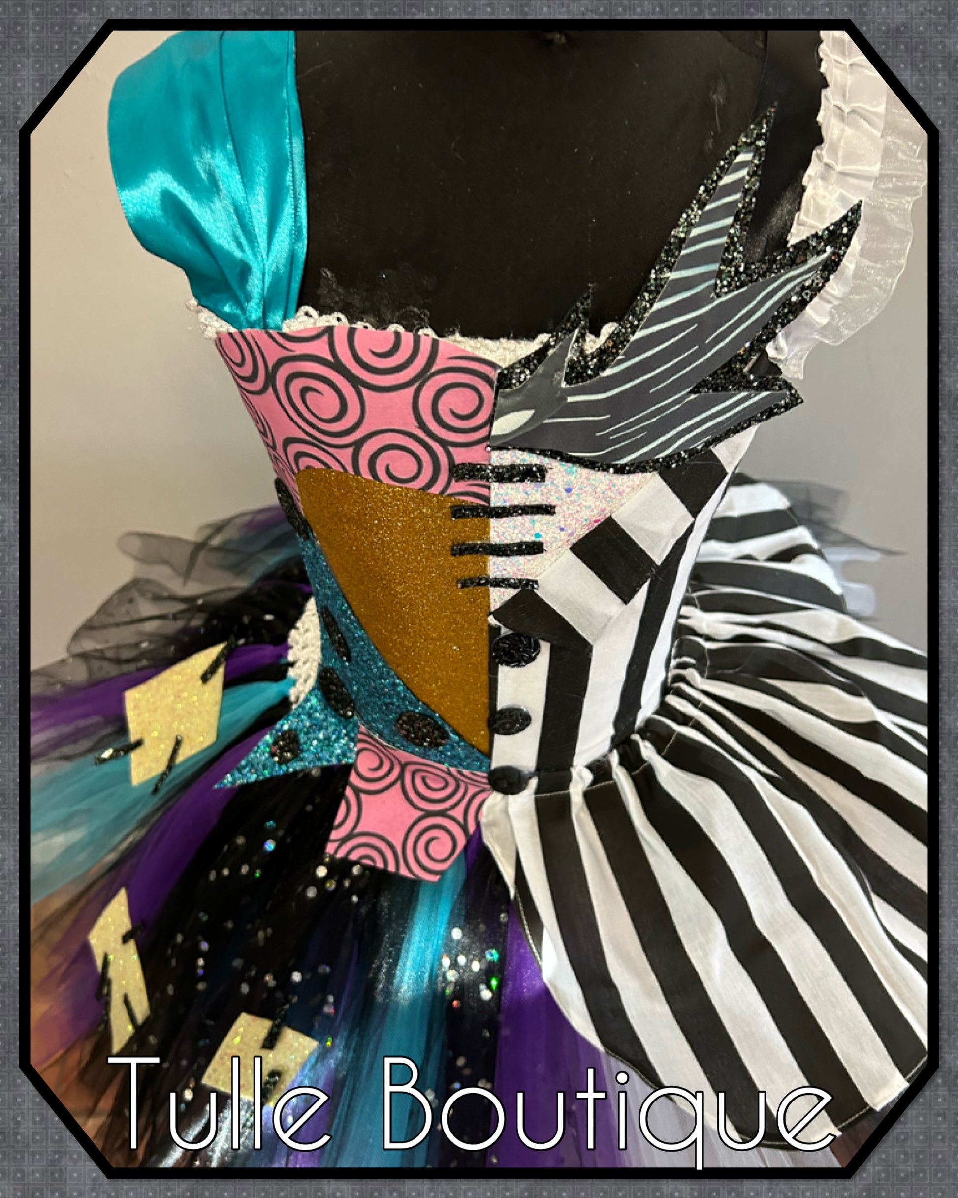 Each tutu is hand tied onto the crochet top with three double layers for extra volume and fullness so it is not see through finished with striped peplum overlay to the waist on the jack side and glitter patches to the sally side.
