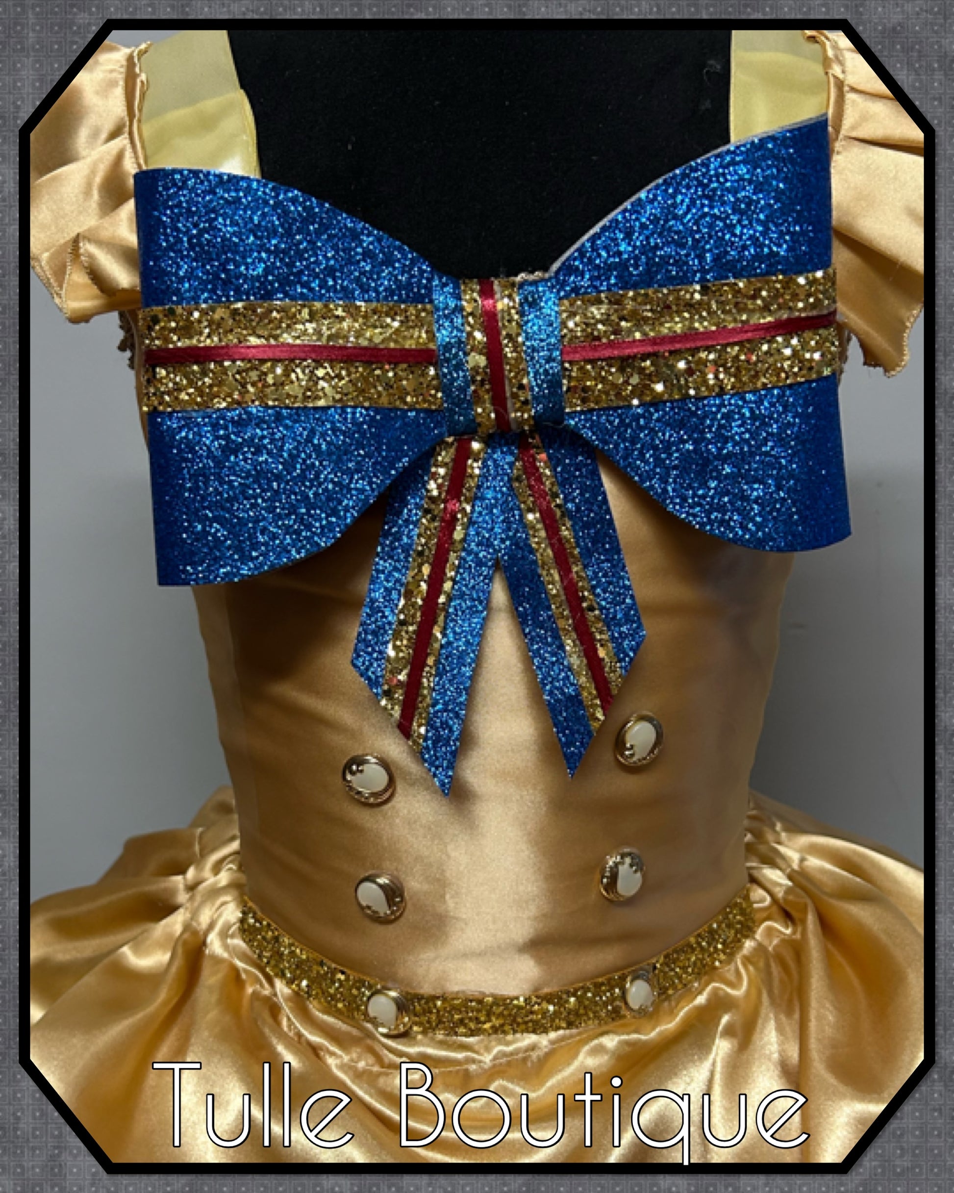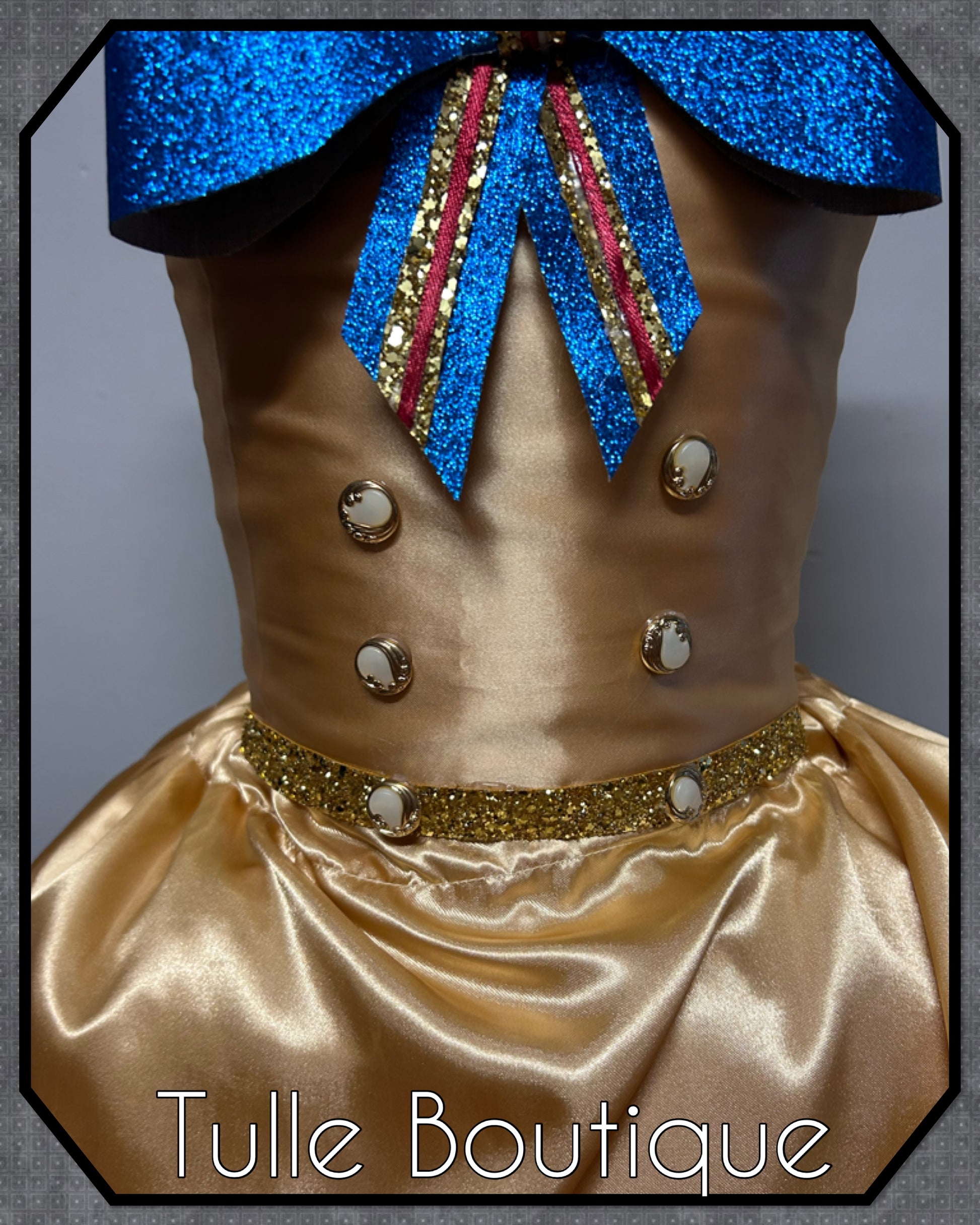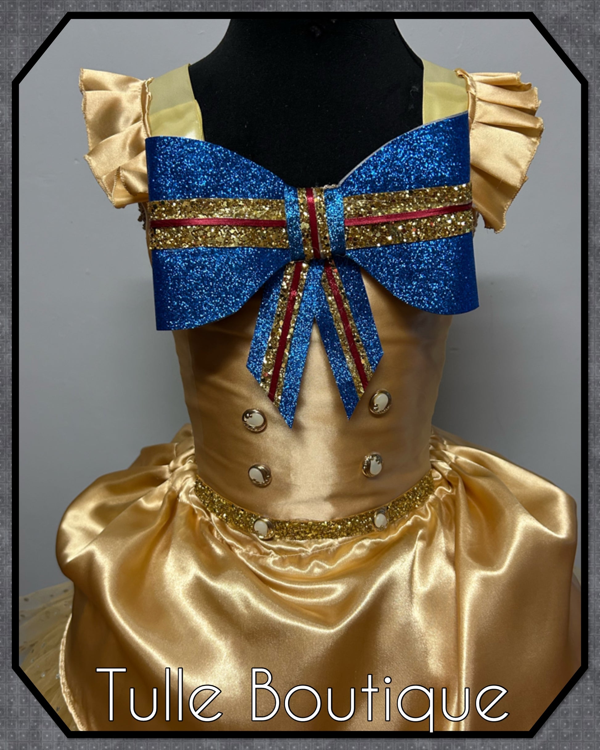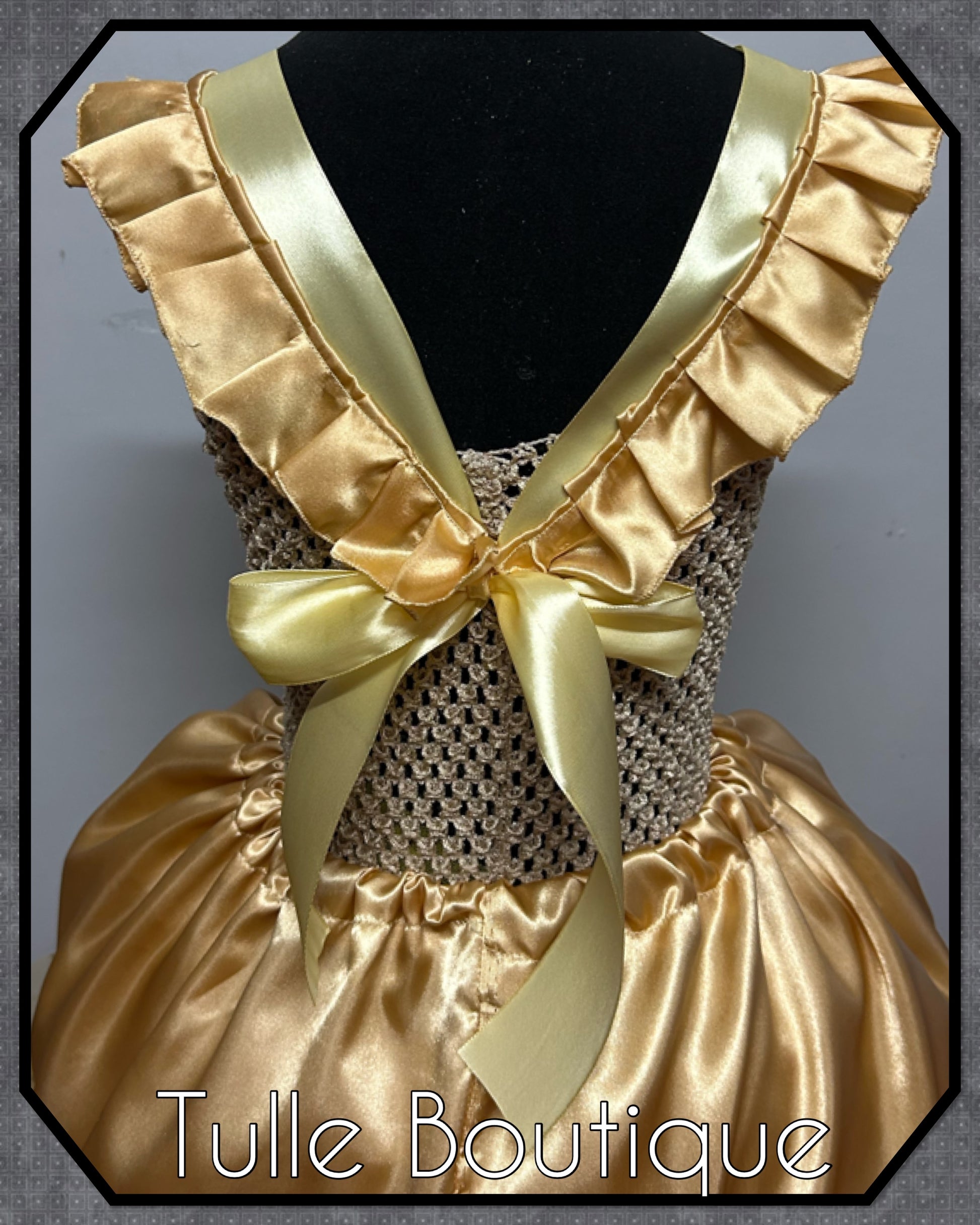 Each tutu is hand tied onto the crochet top with two double layers for extra volume and fullness so it is not see through with added sparkle sequin tulle. The gold satin overlayer adds some extra class to this killer doll outfit.