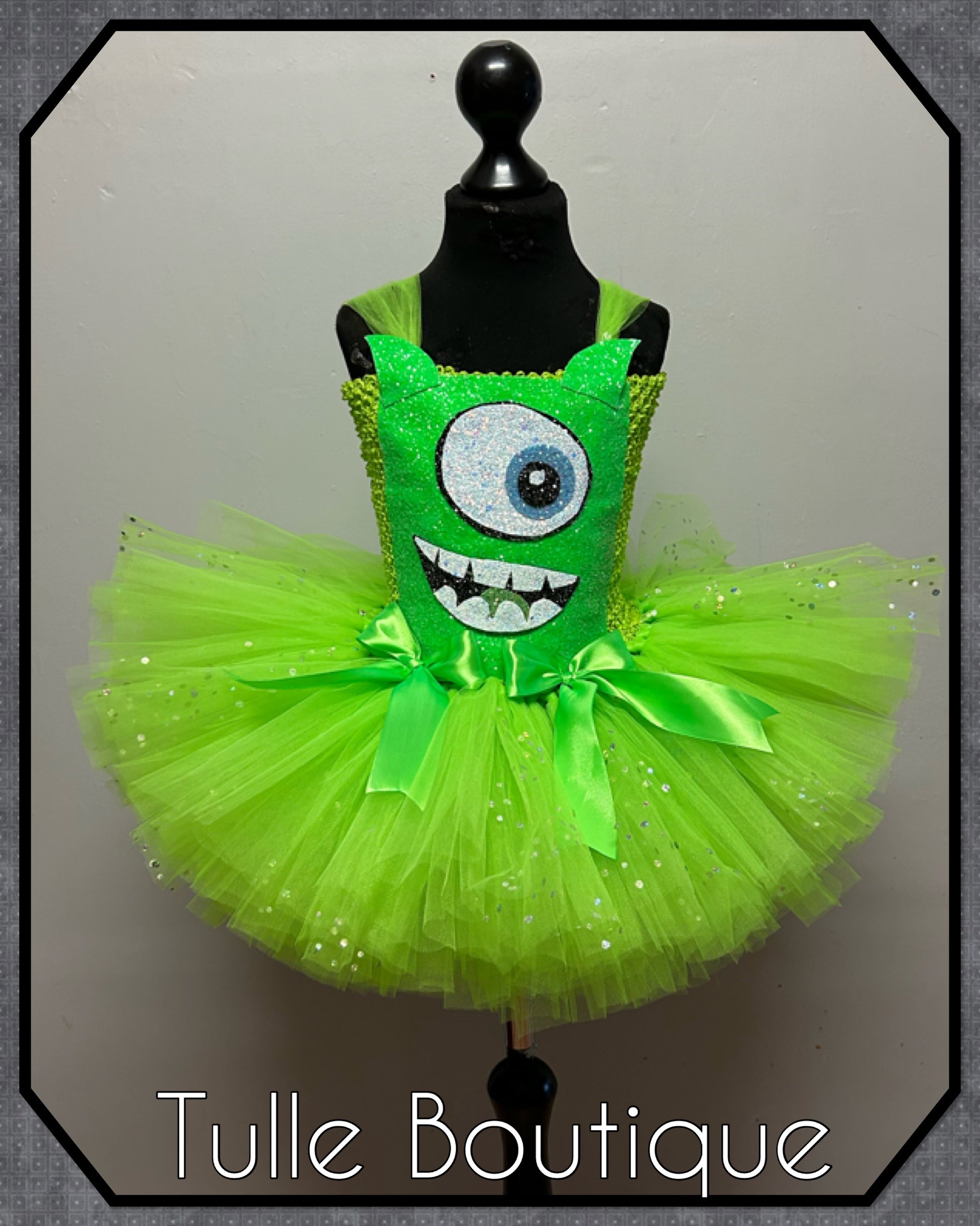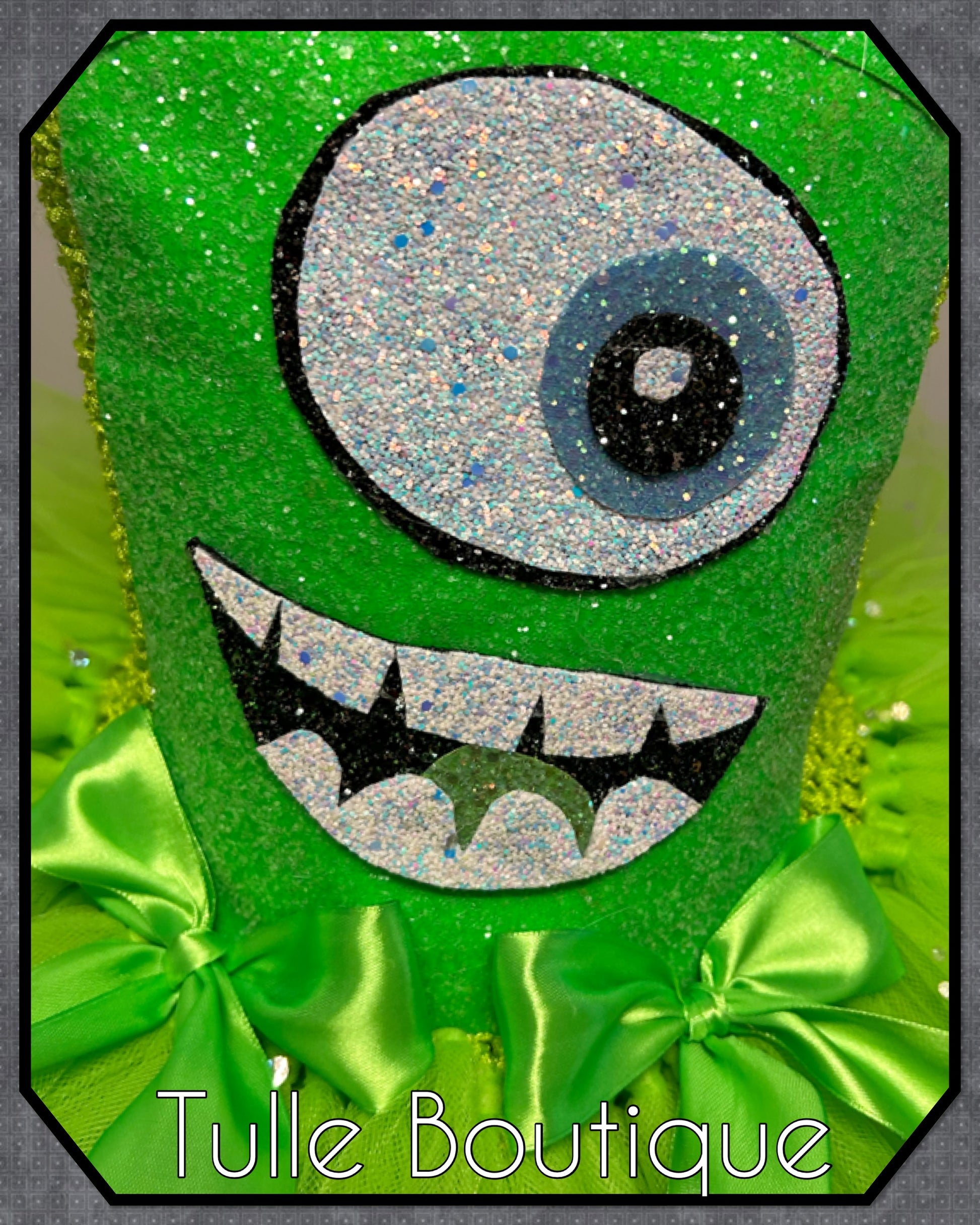Featuring a glitter front with glitter details to mimic Mikes face, finished with 2 bows on the waist.