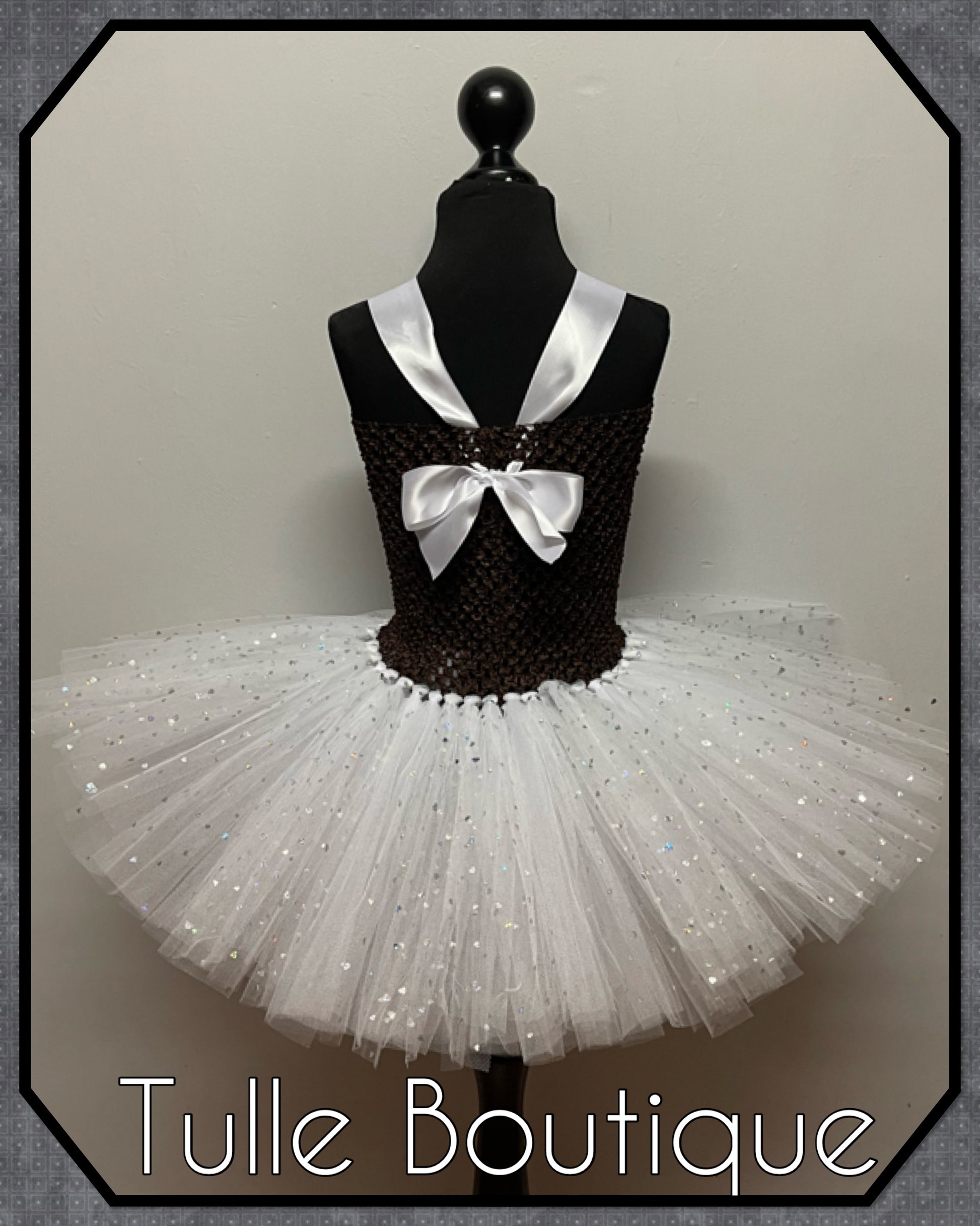 Each tutu is hand tied onto the crochet top with two double layers for extra volume and fullness so it is not see through with the top layers made using sparkle sequin tulle.