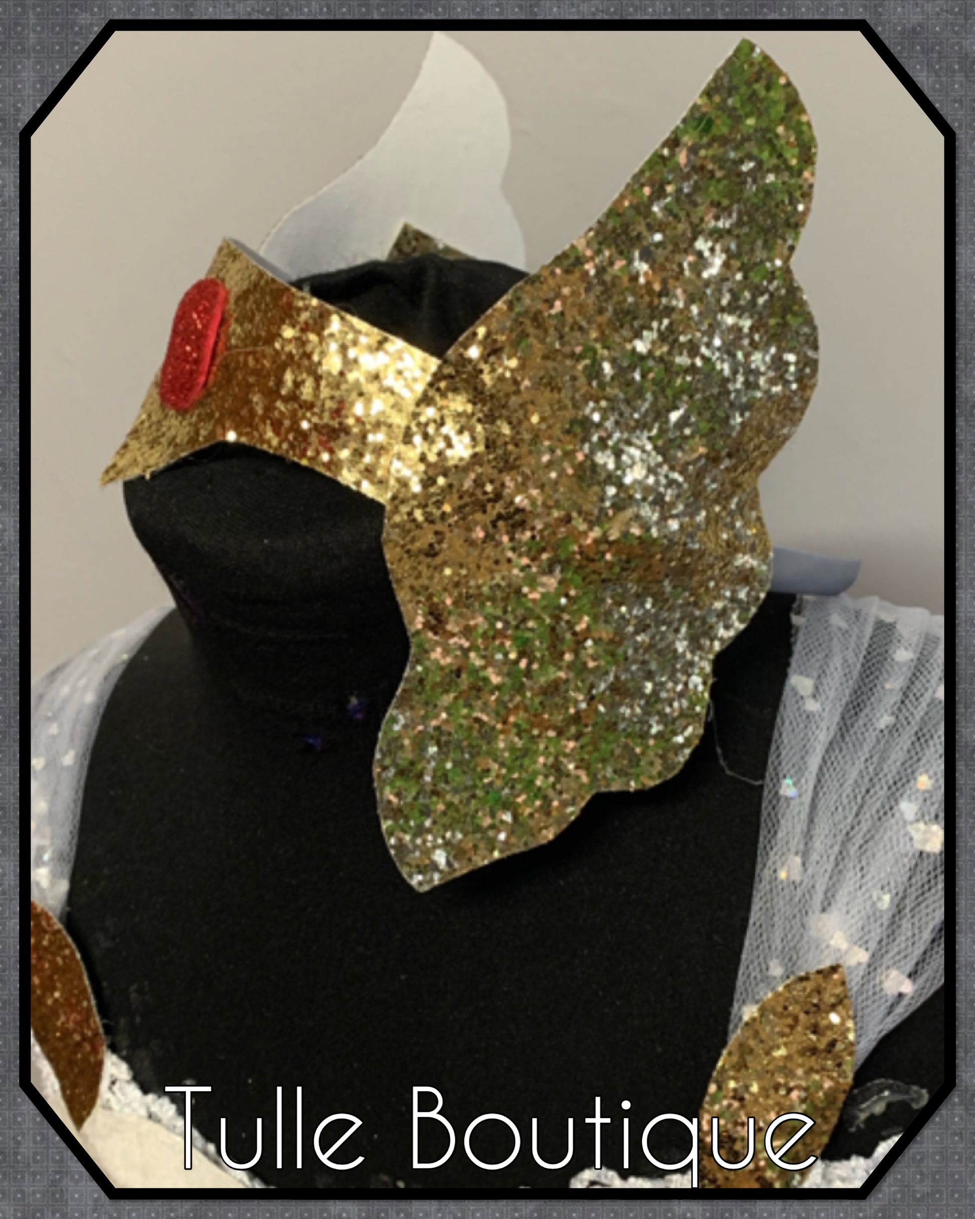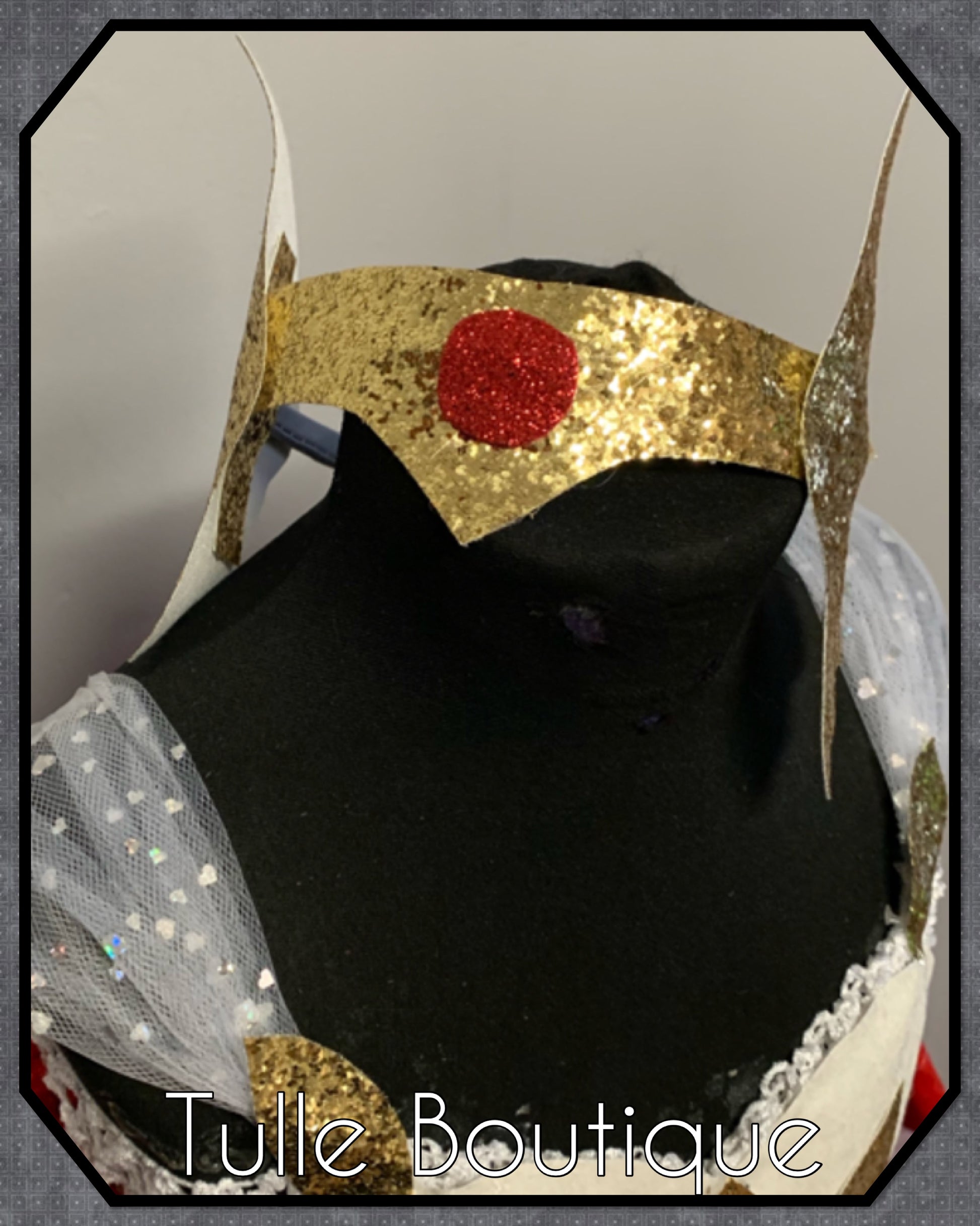 Featuring a glitter front with gold glitter detailing to the waist and chest. The back is finished with a red cape that buttons on and off.