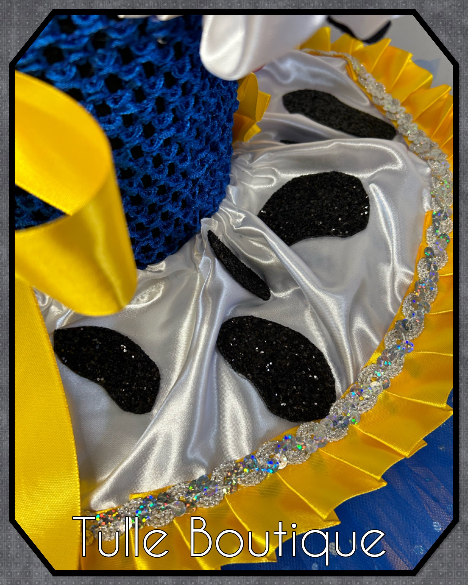Featuring a glitter front with picture patch,satin trim and large crystal on the neckline.