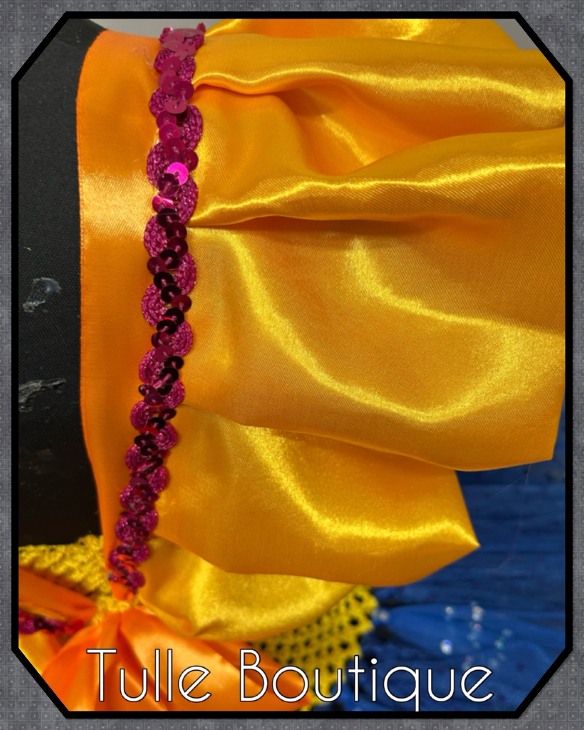 Featuring a glitter front with satin trim and sparkles on the neckline.