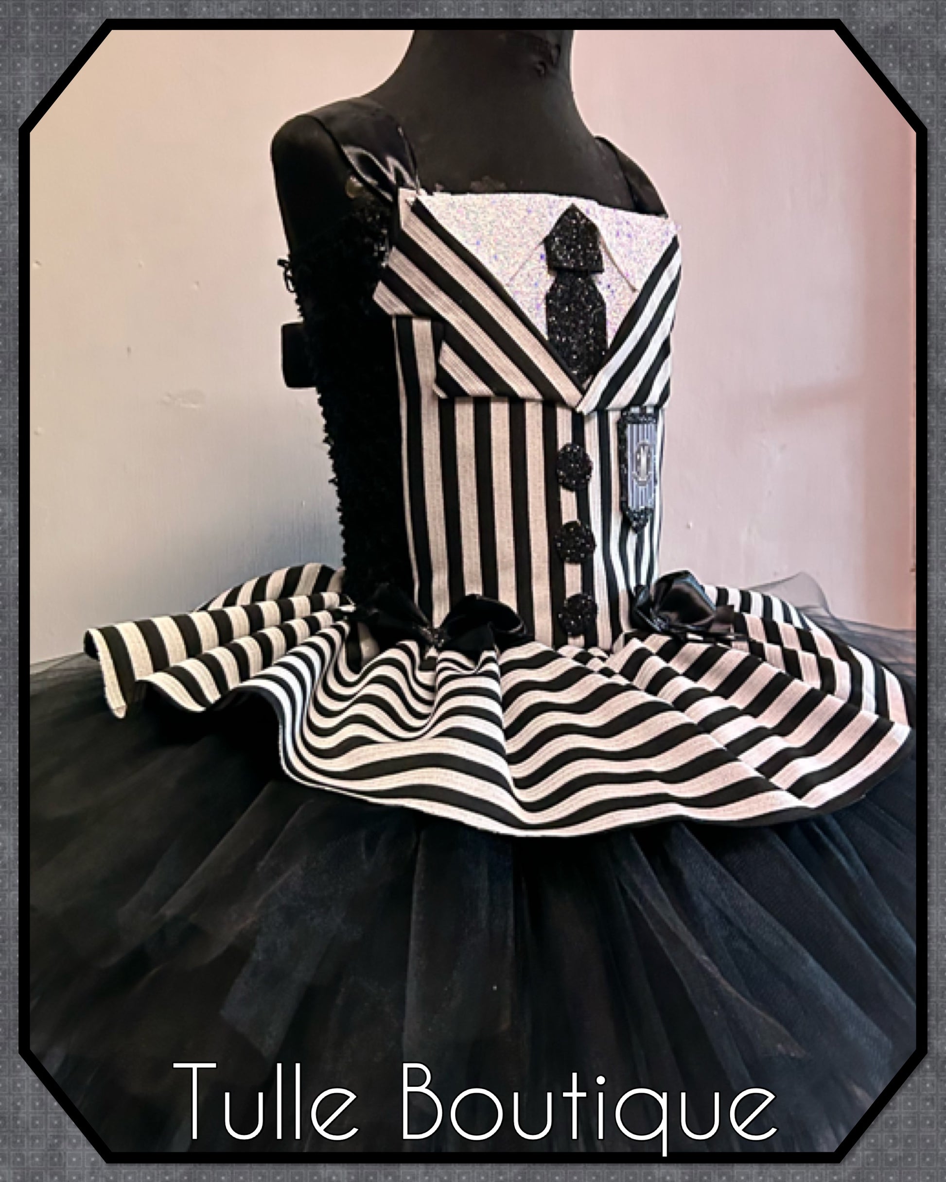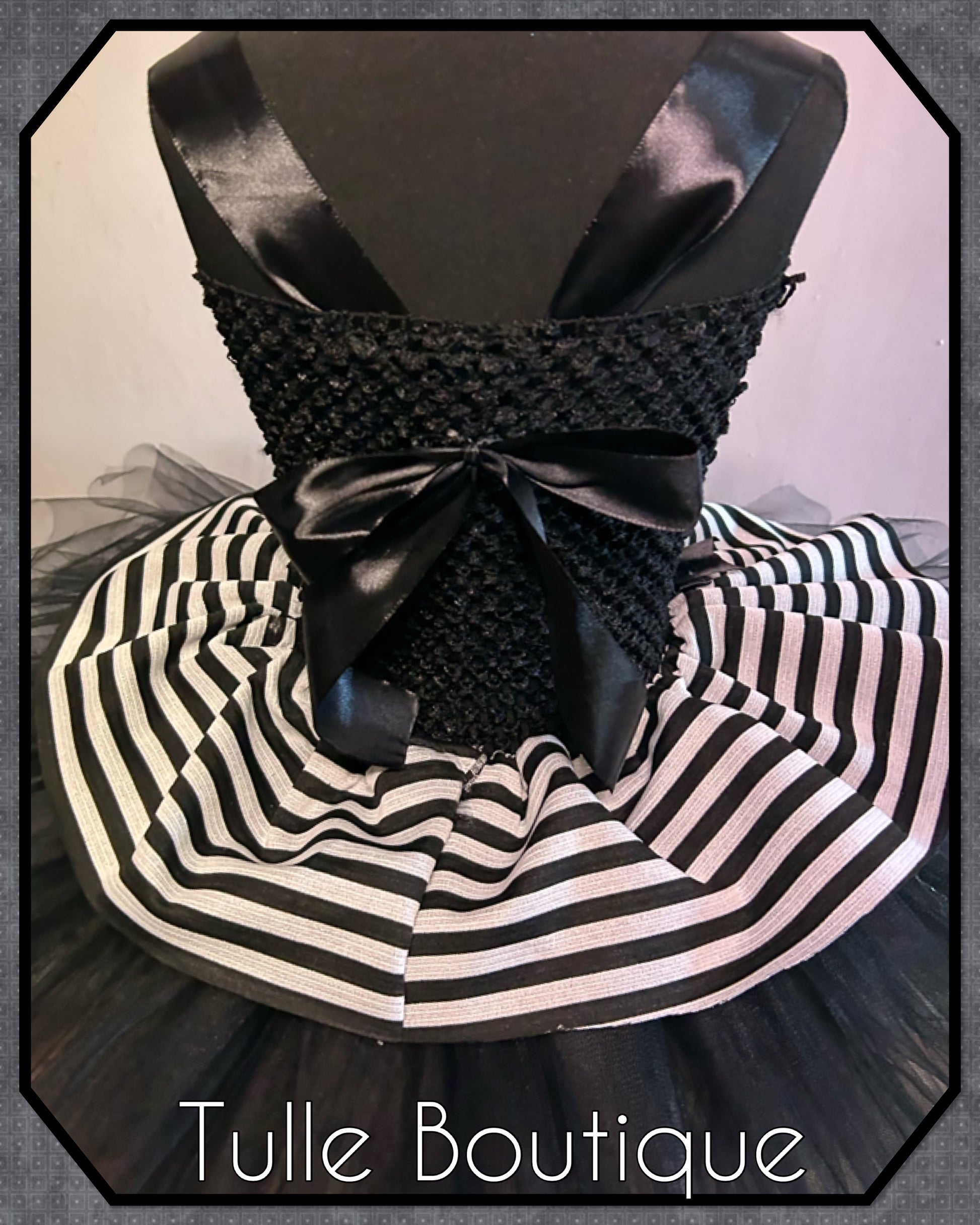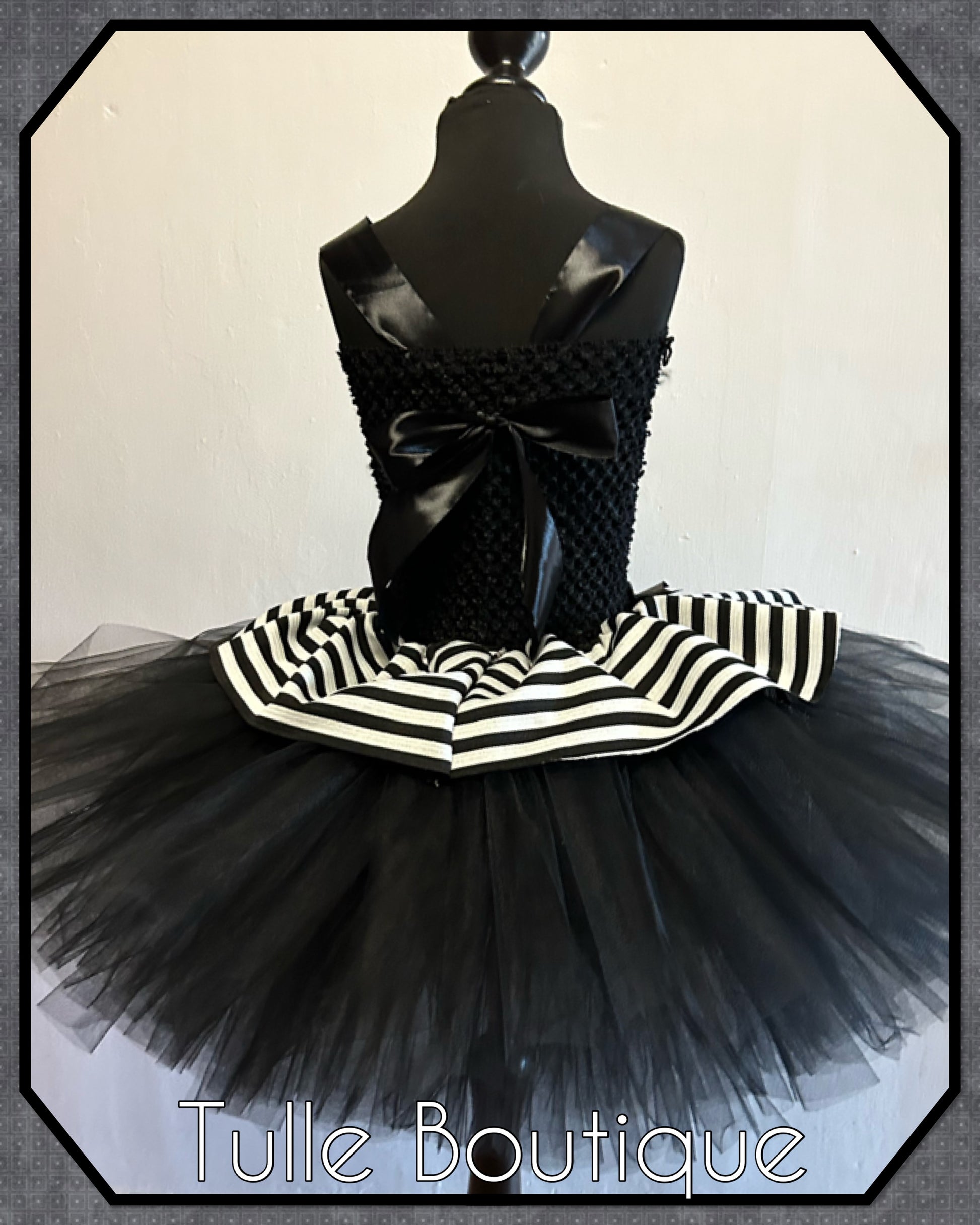 Each tutu is hand tied onto the crochet top with three double layers for extra volume and fullness so it is not see through finished with striped peplum overlay to the waist for that extra fullness