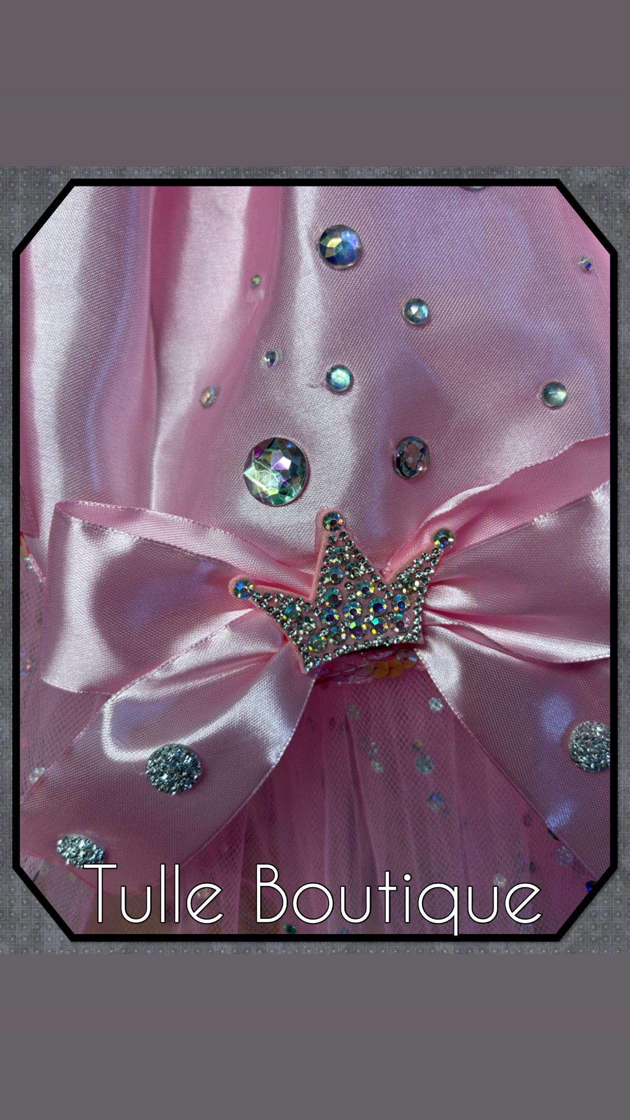 Featuring a glitter front with picture patch,satin trim and large crystal on the neckline.
