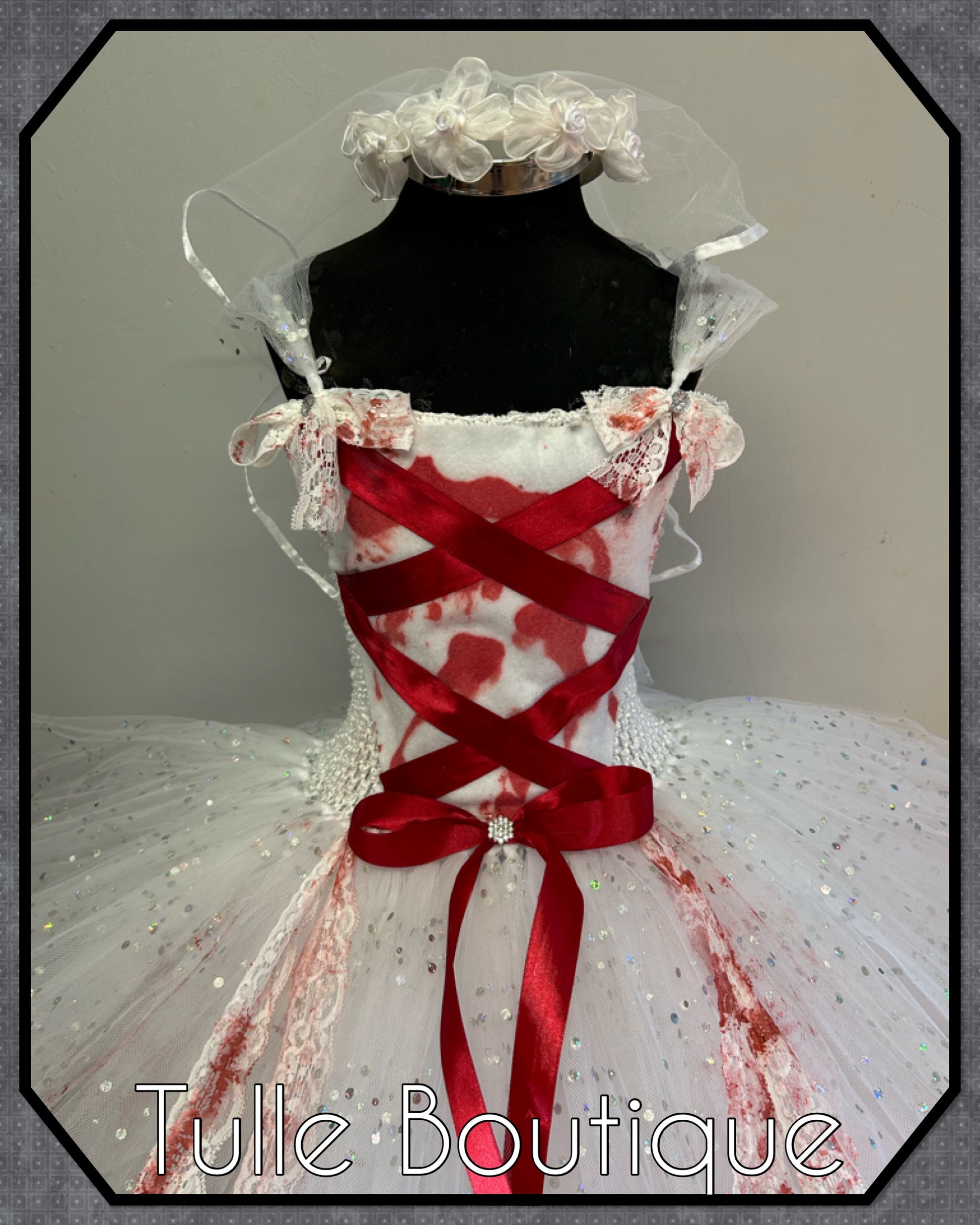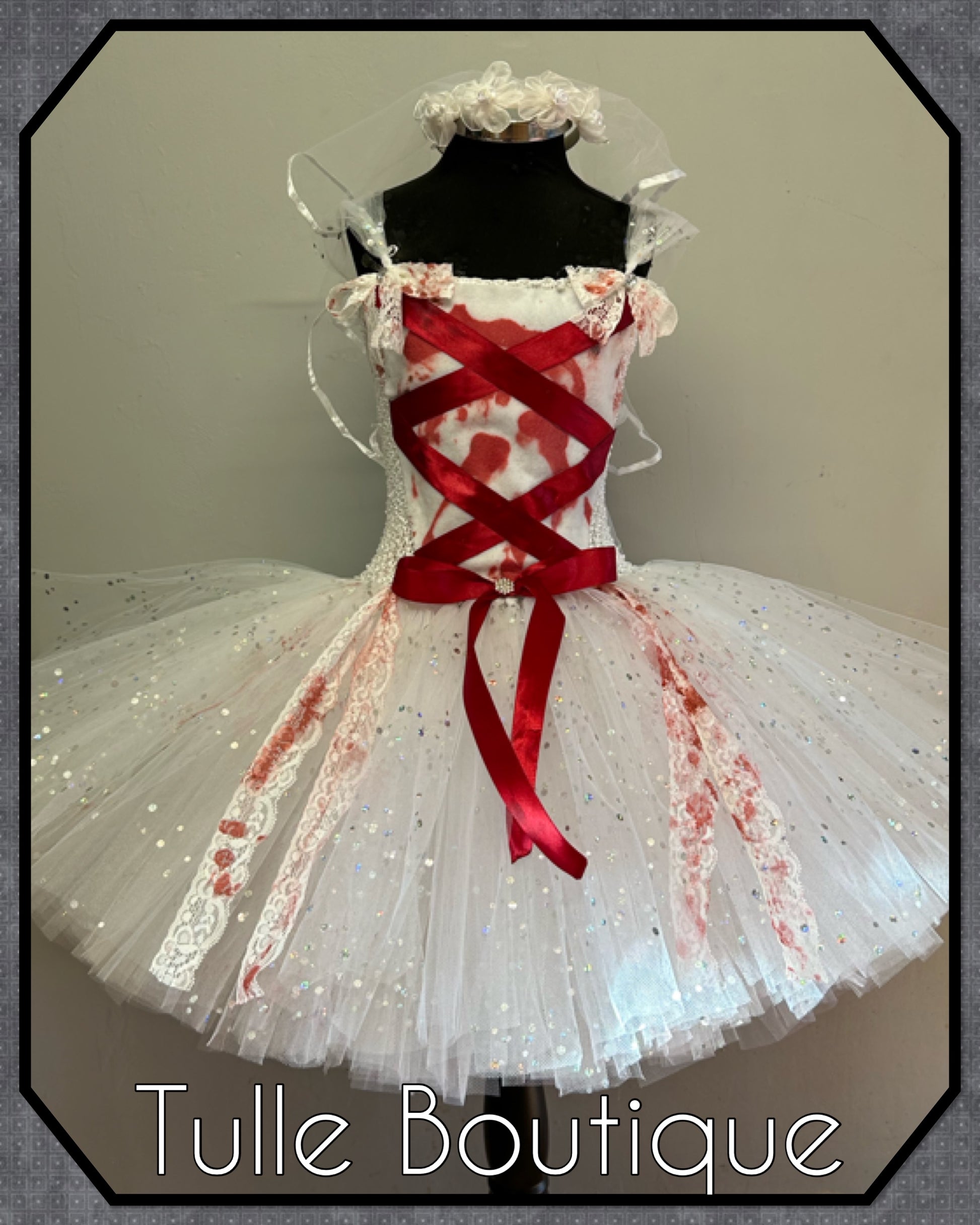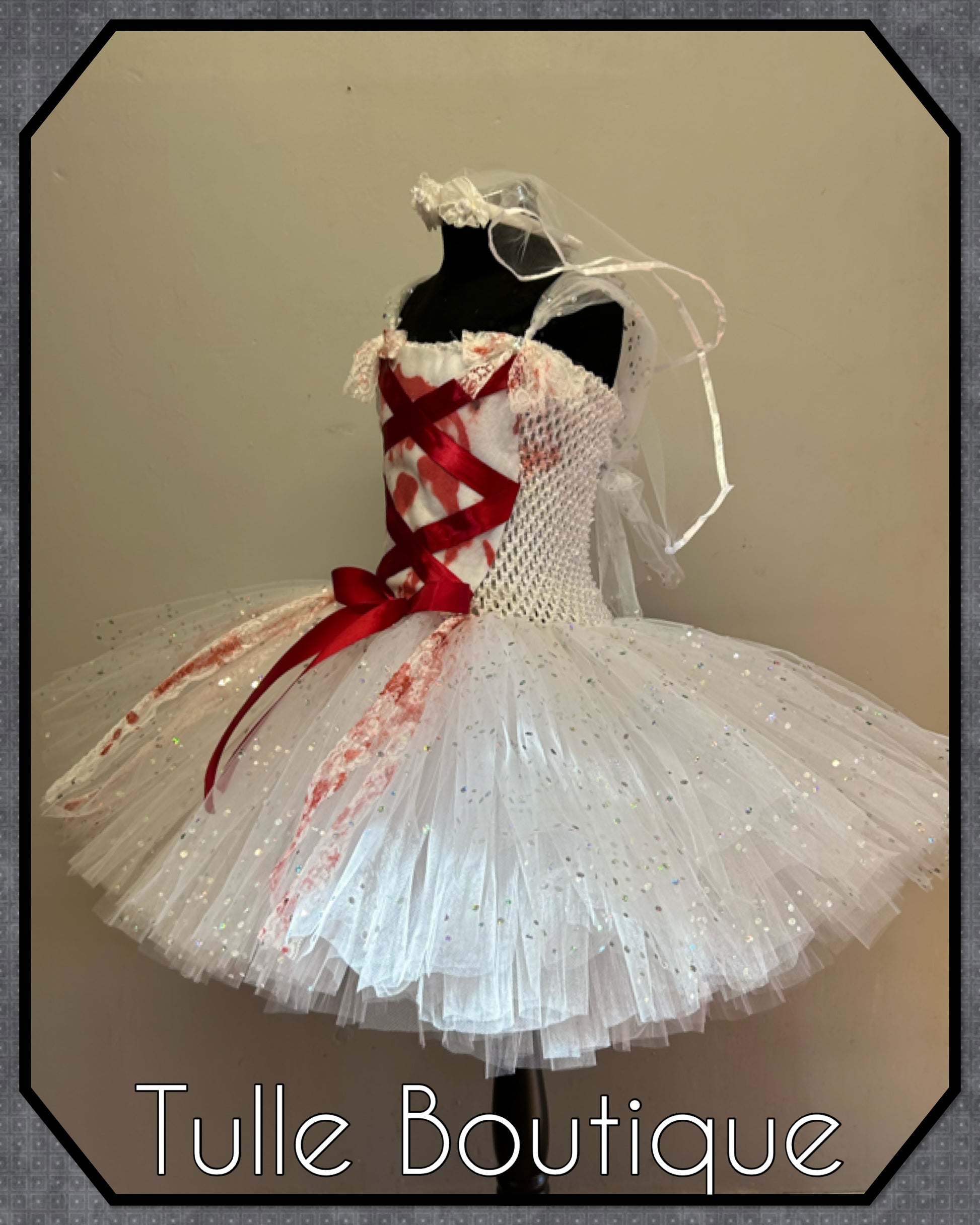 Each tutu is hand tied onto the crochet top with three double layers for extra volume and fullness so it is not see through with blood stained lace added to the front.