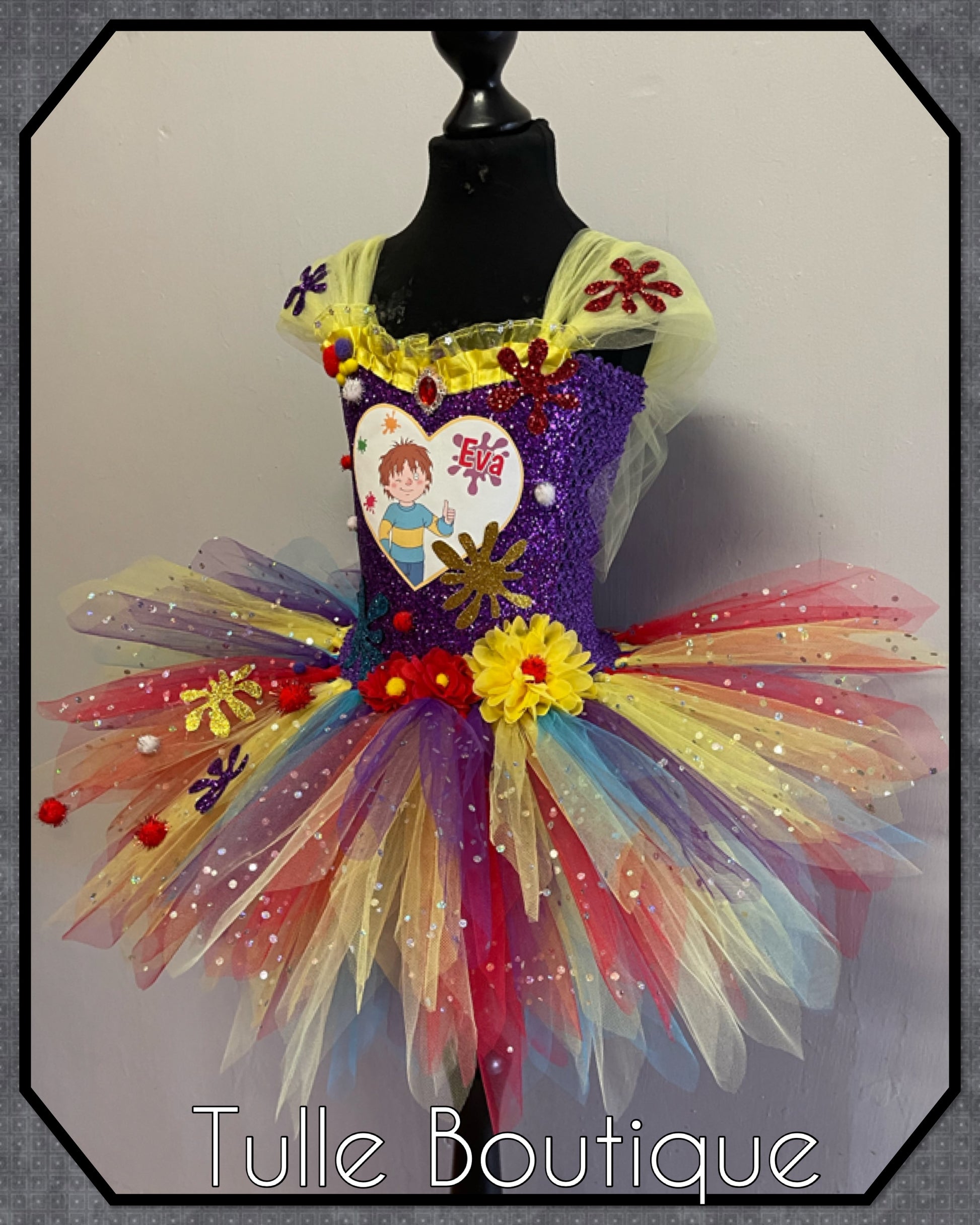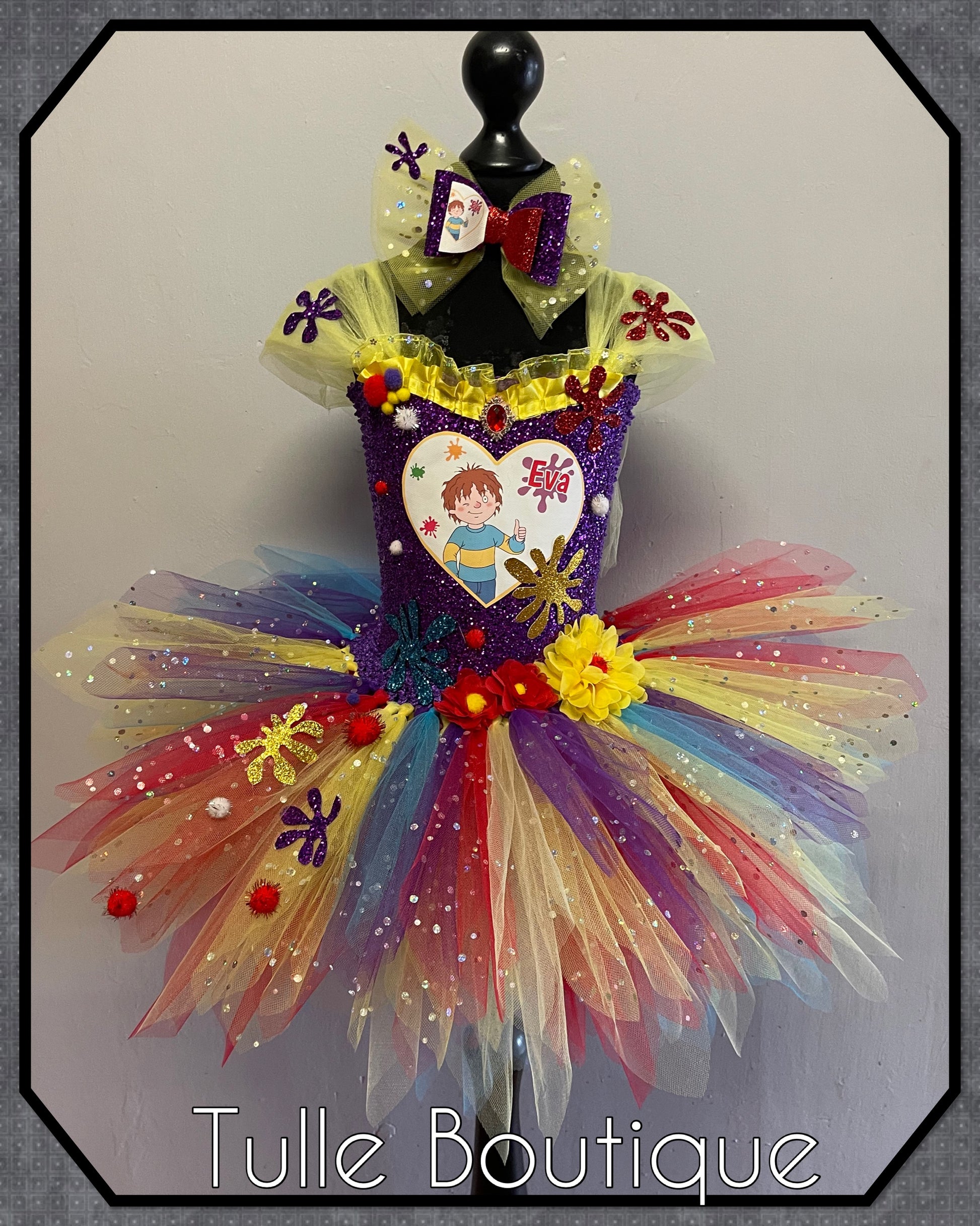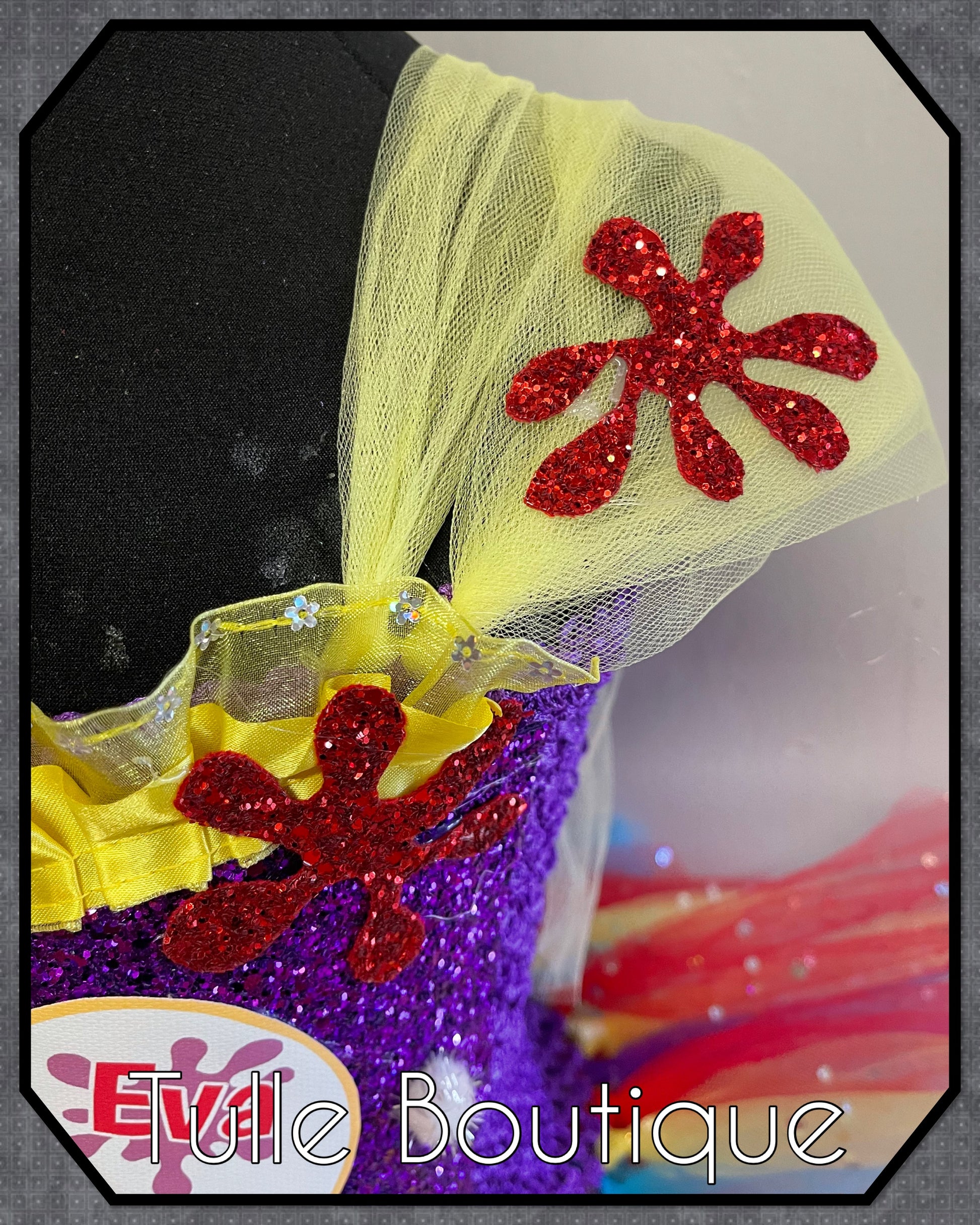 Featuring a picture patch which can be personalized with your little ones name, satin trim and rhinestones. Added glitter splats and pompoms gives this dress a pop of colour.