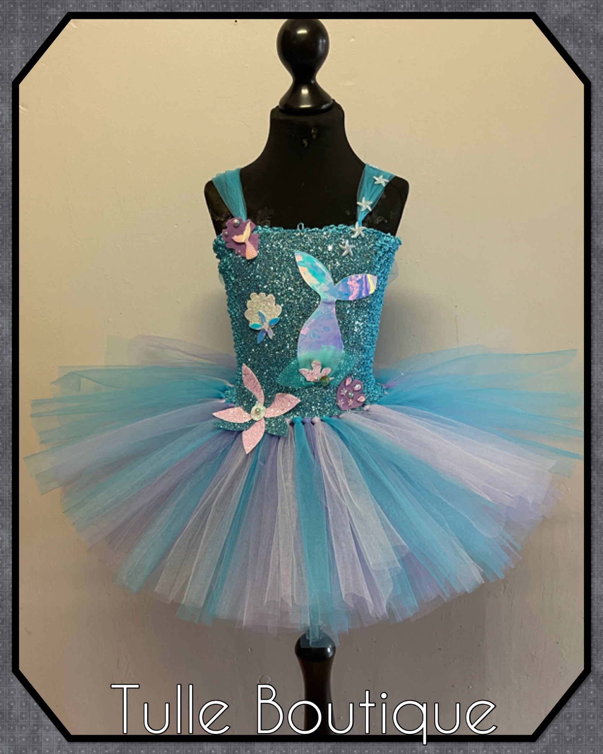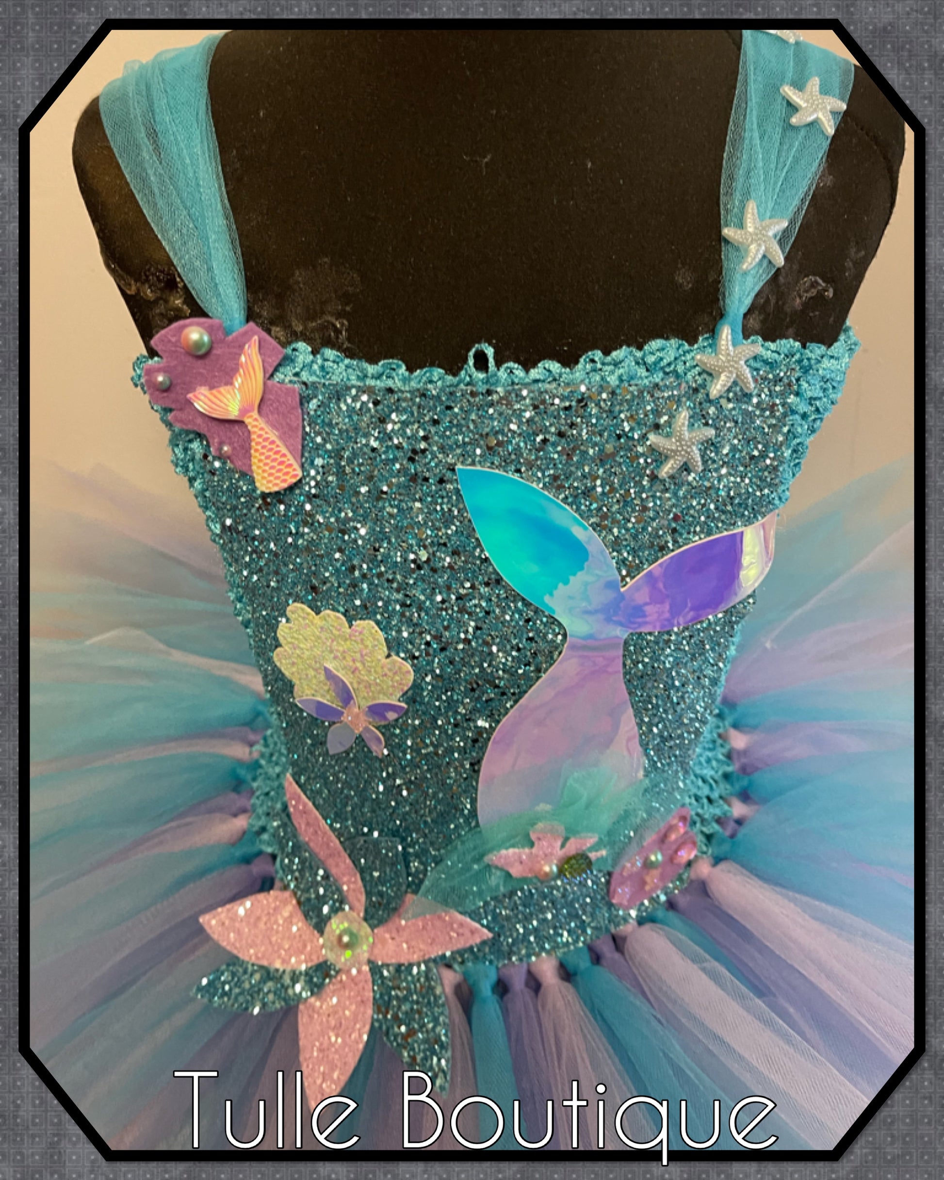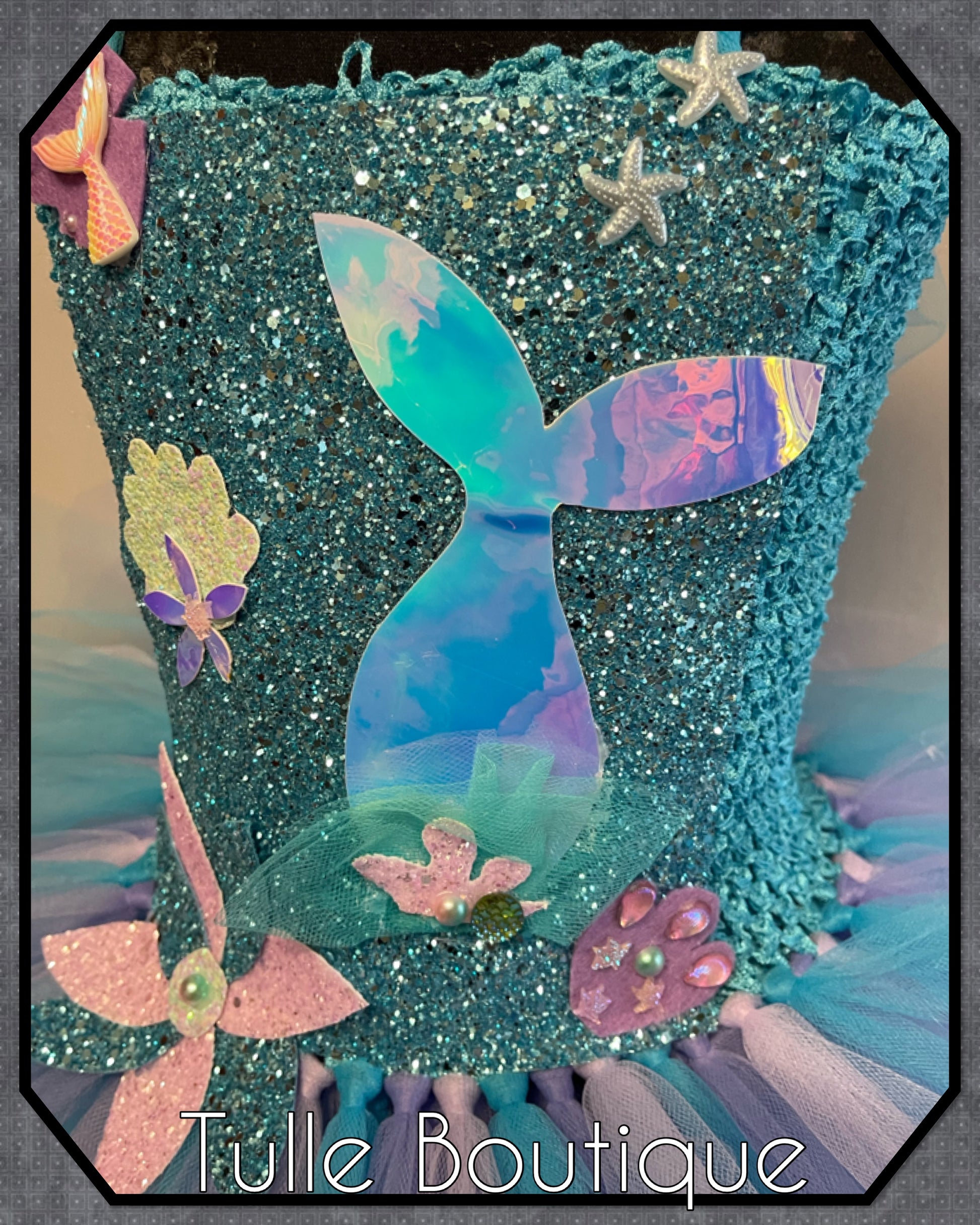 Featuring a glitter front with holographic mermaid tail and shell detail with glitter flower on the waist.