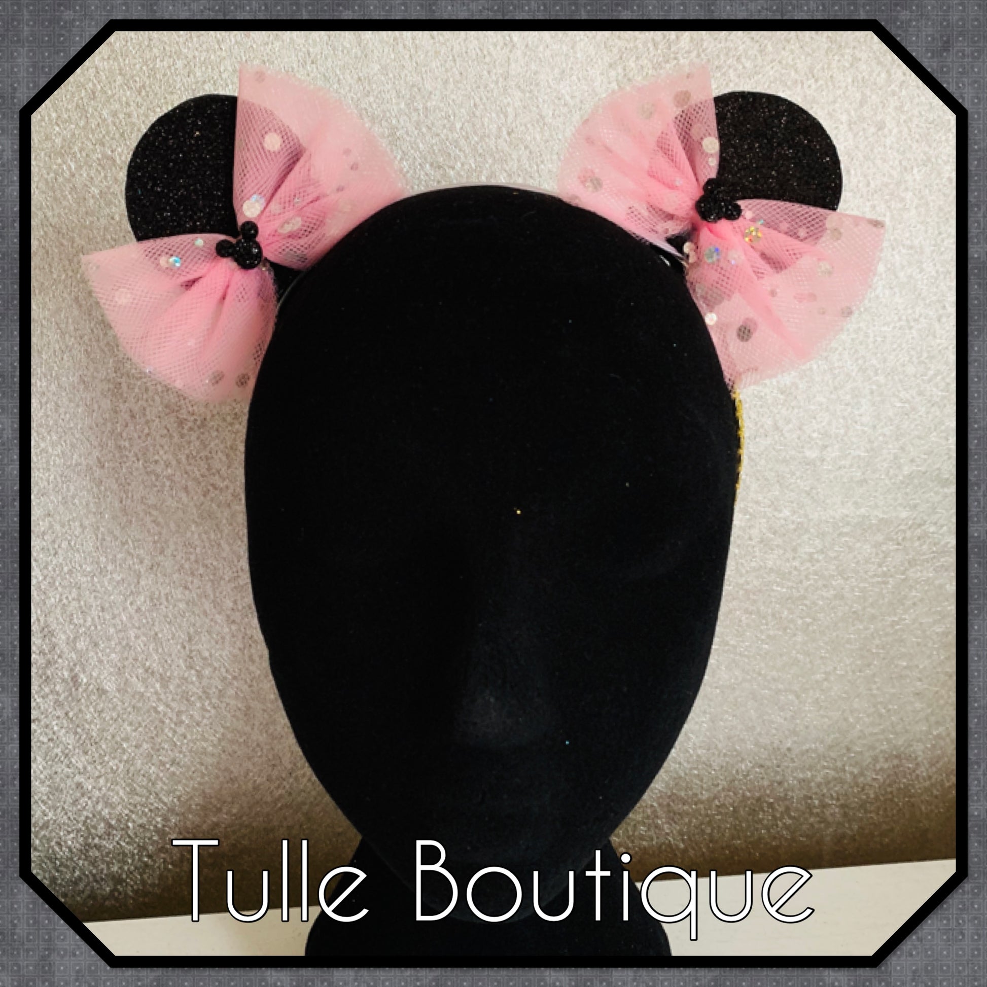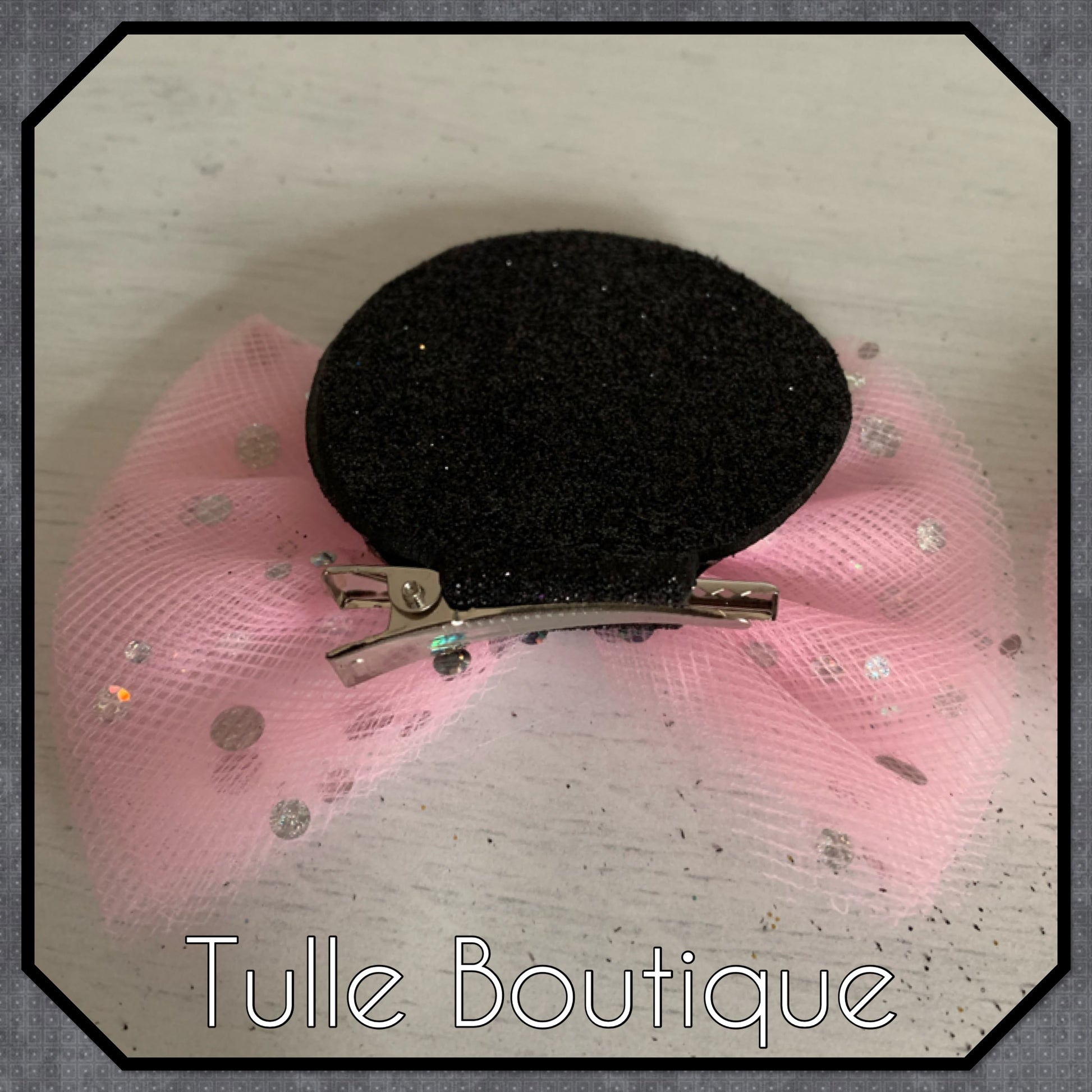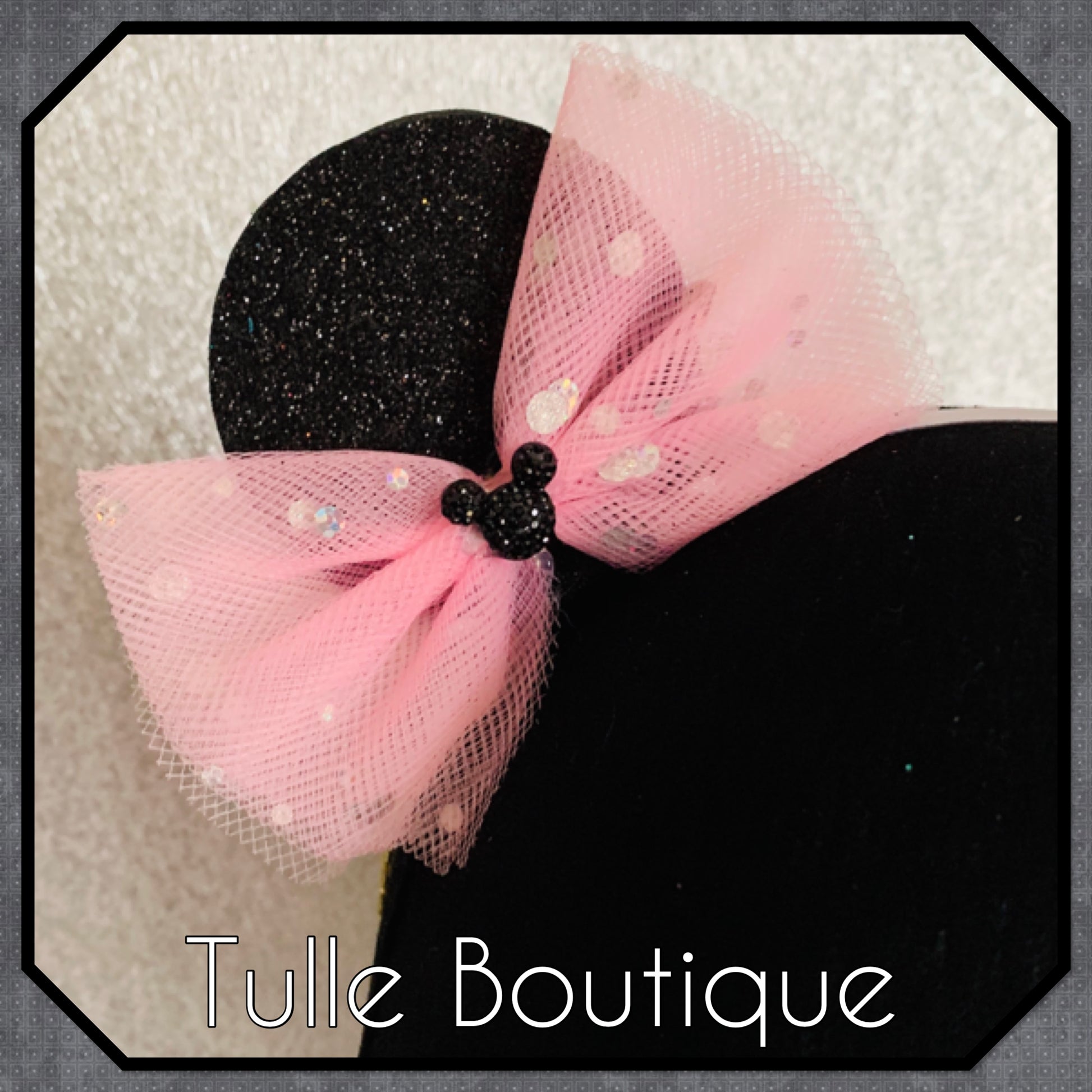 Featuring a glitter front with glitter Minnie Mouse head, satin trim and large crystal on the neckline.