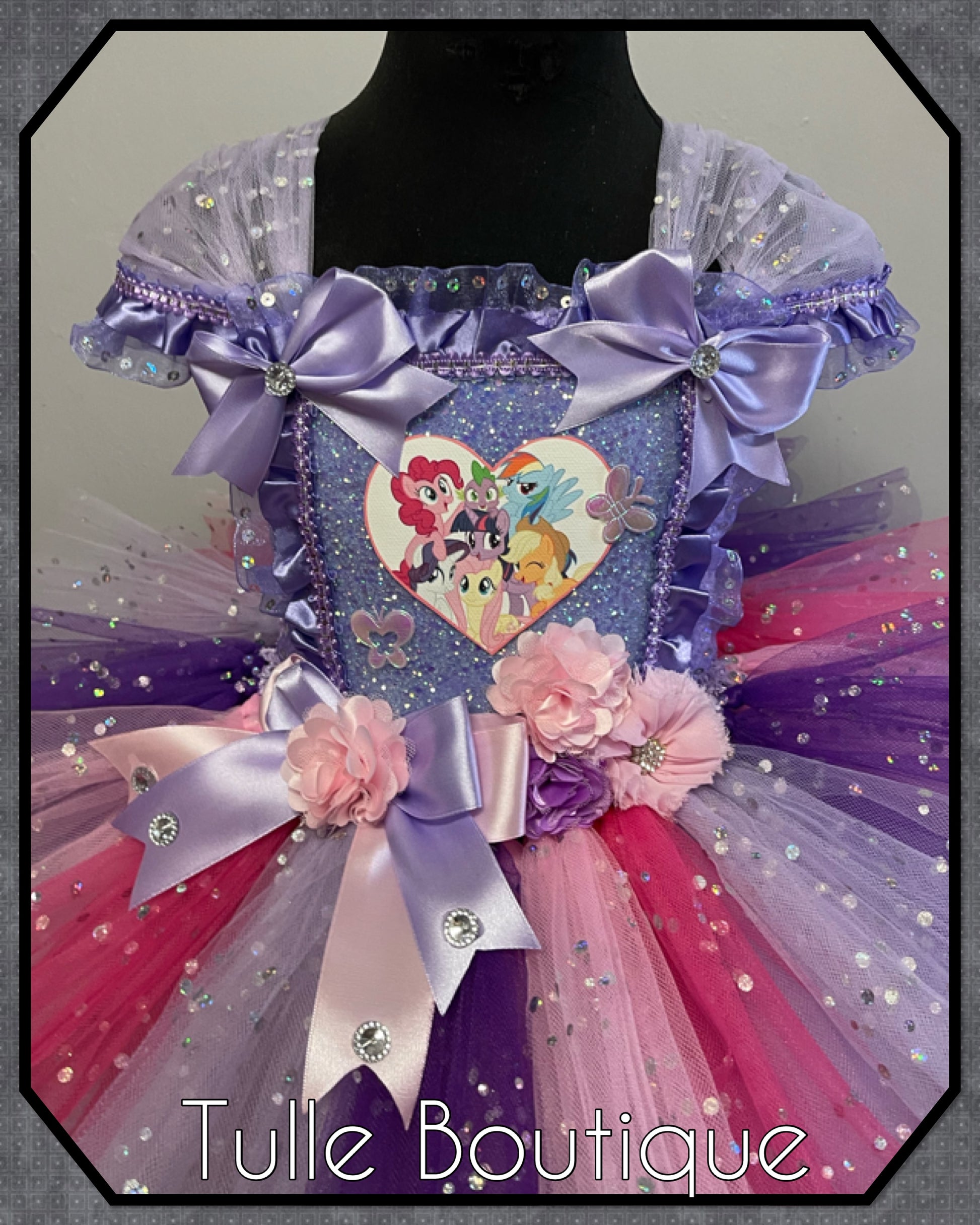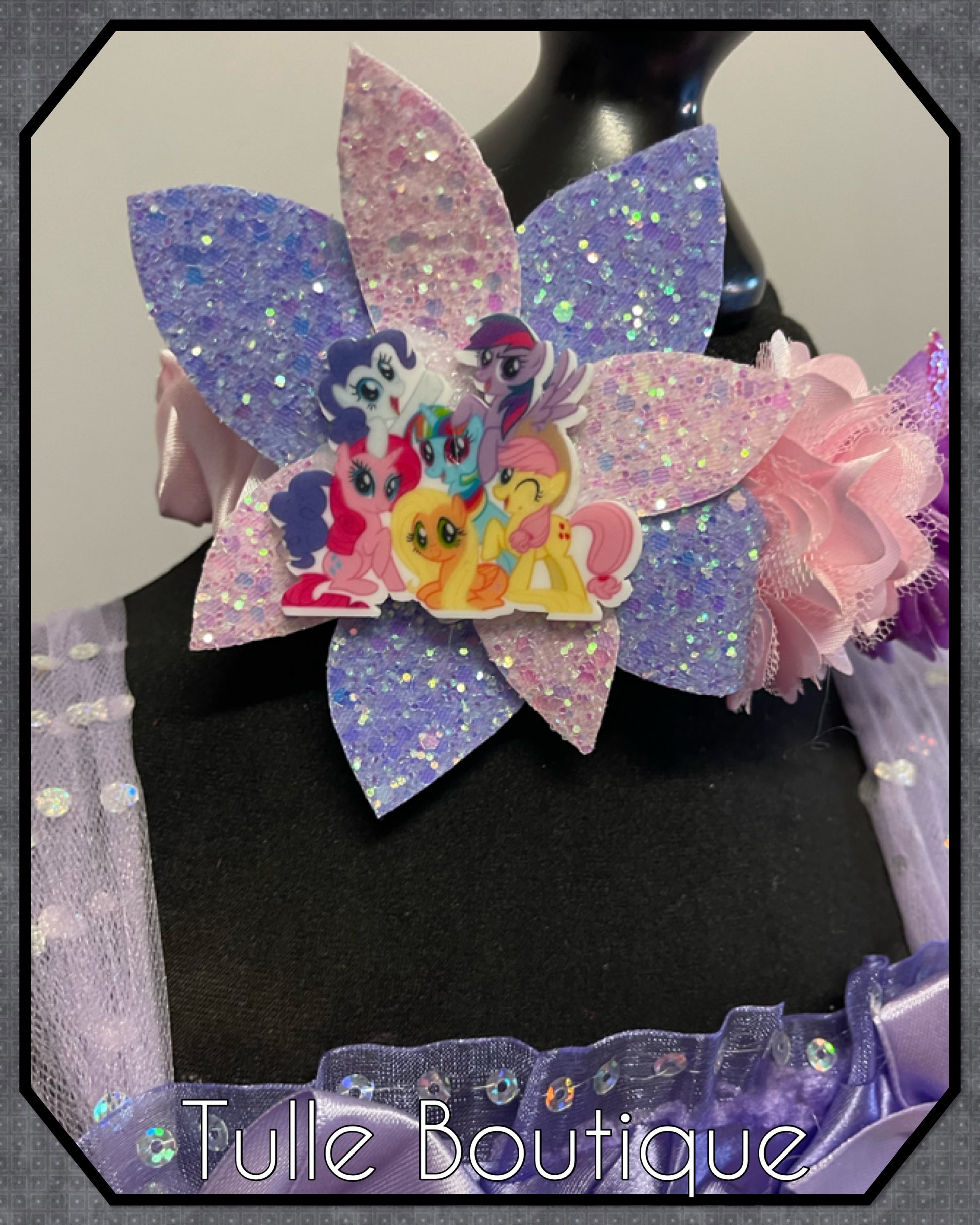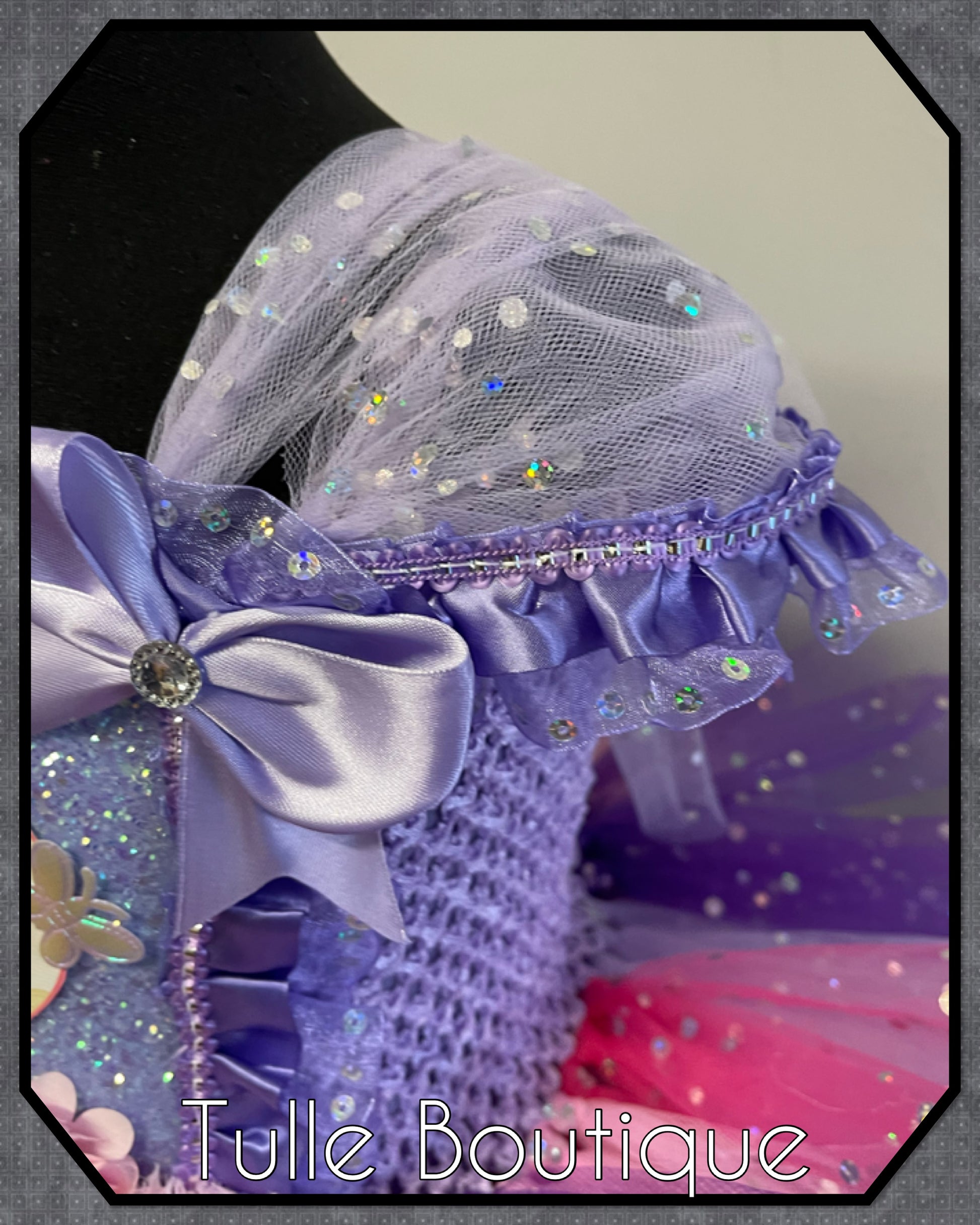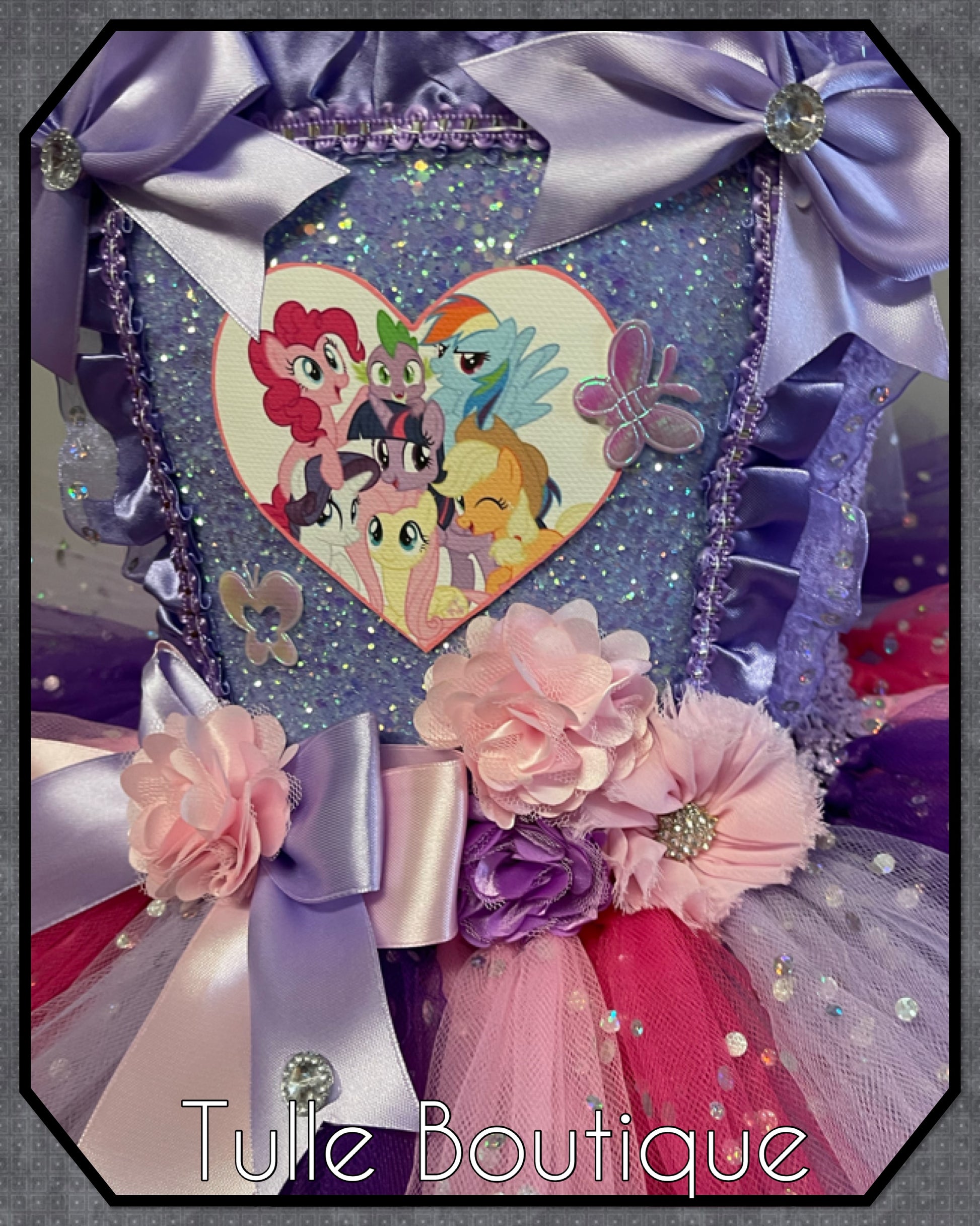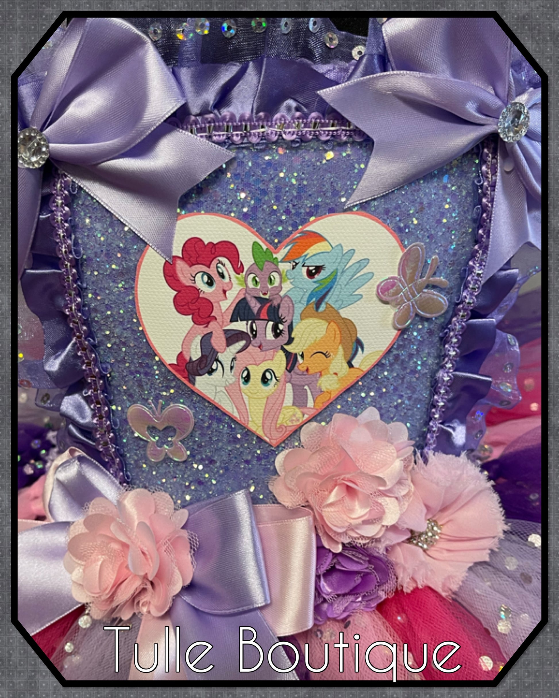 Featuring a glitter front with picture patch and satin bows. The satin trim continues over the shoulders creating a beautiful cap sleeve.