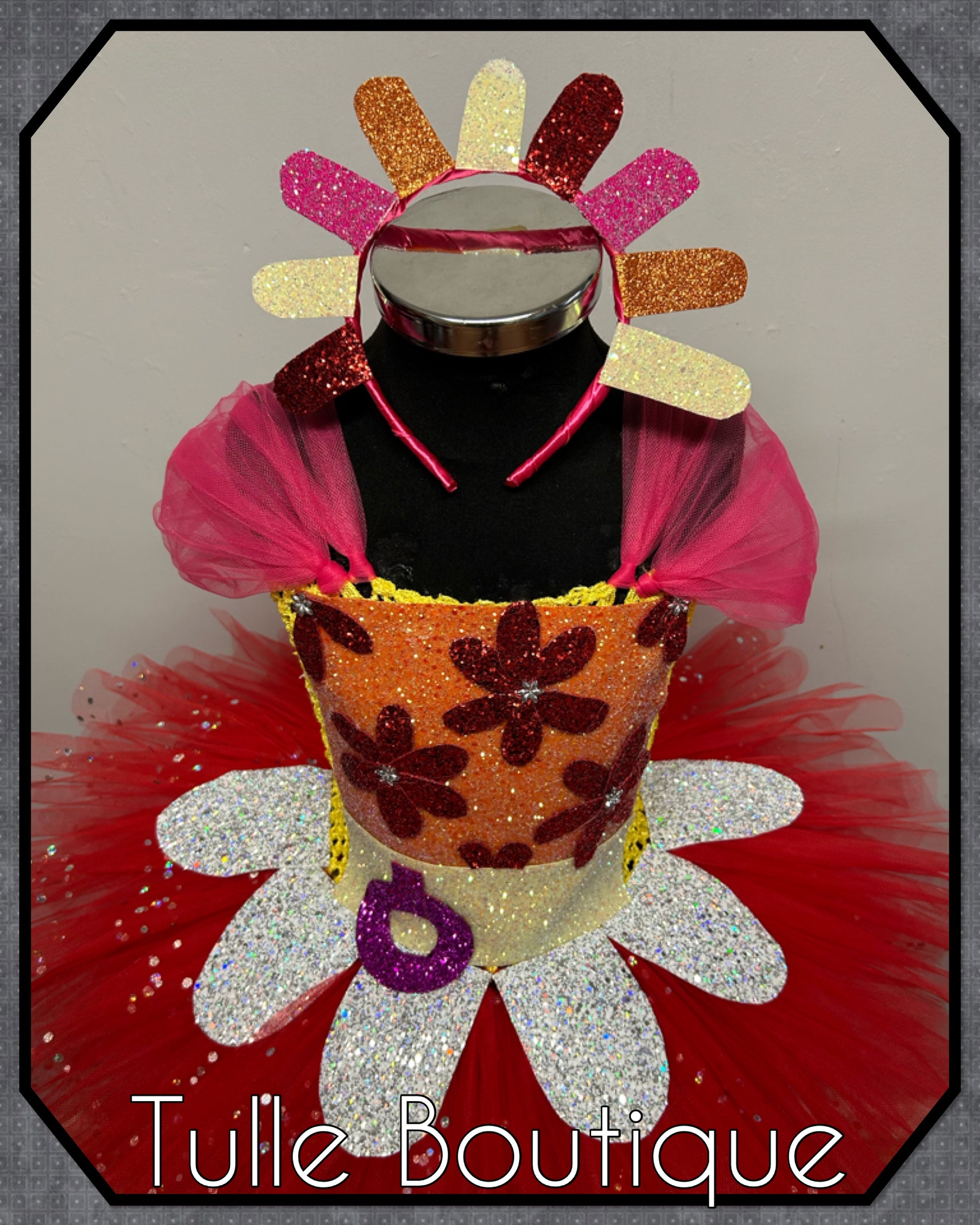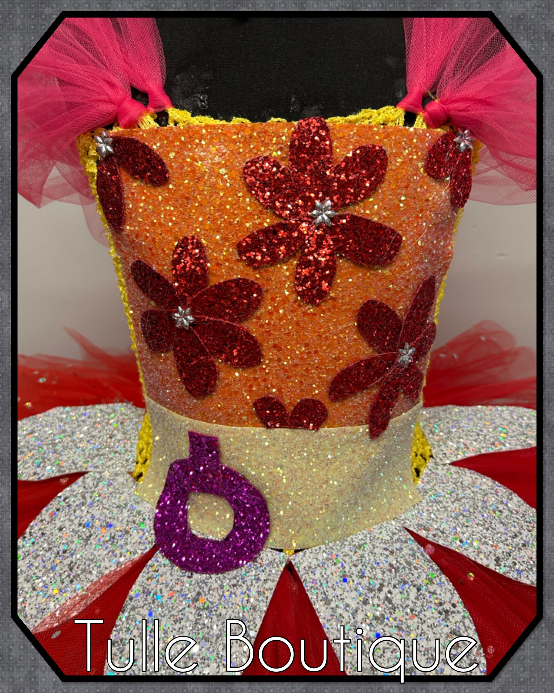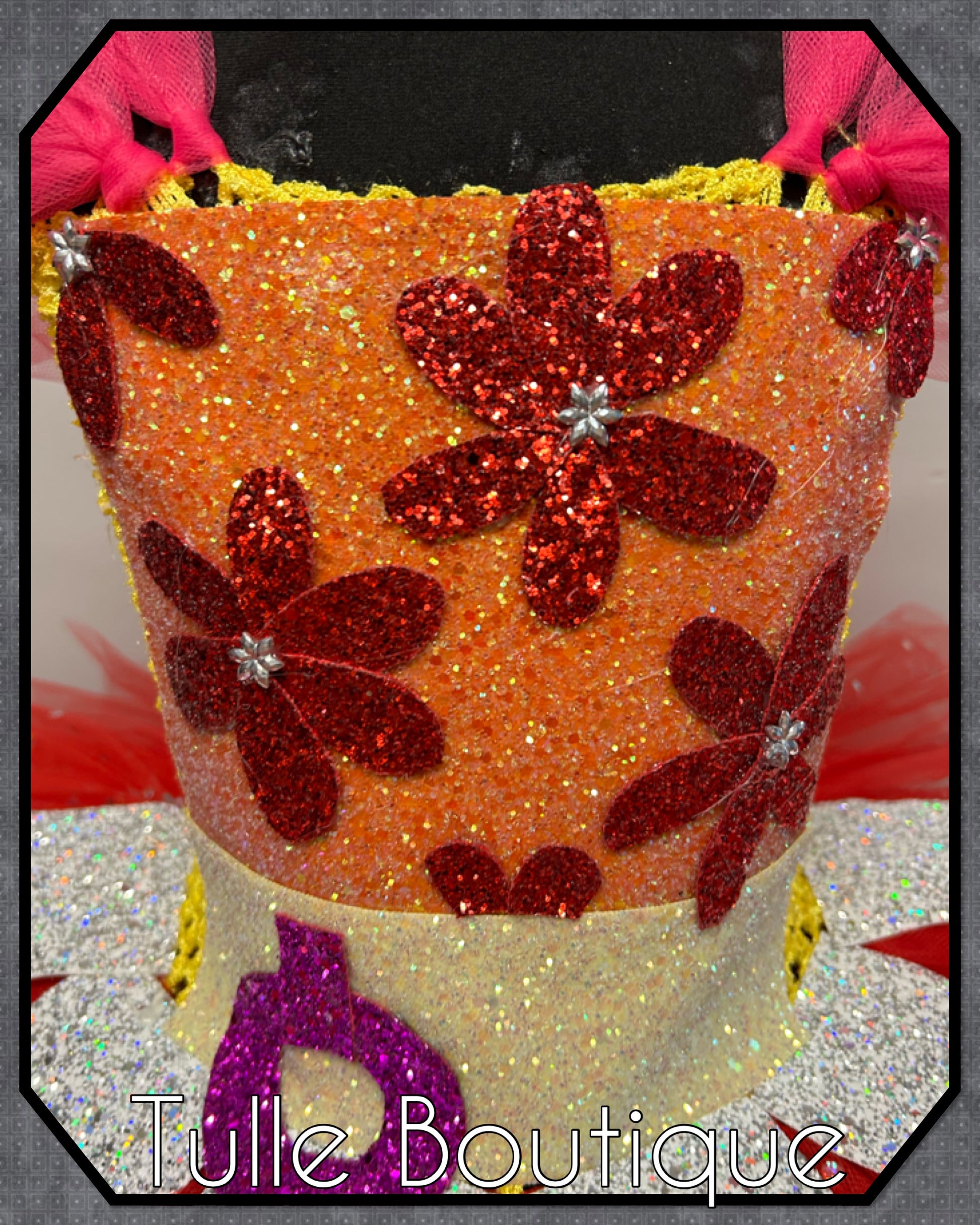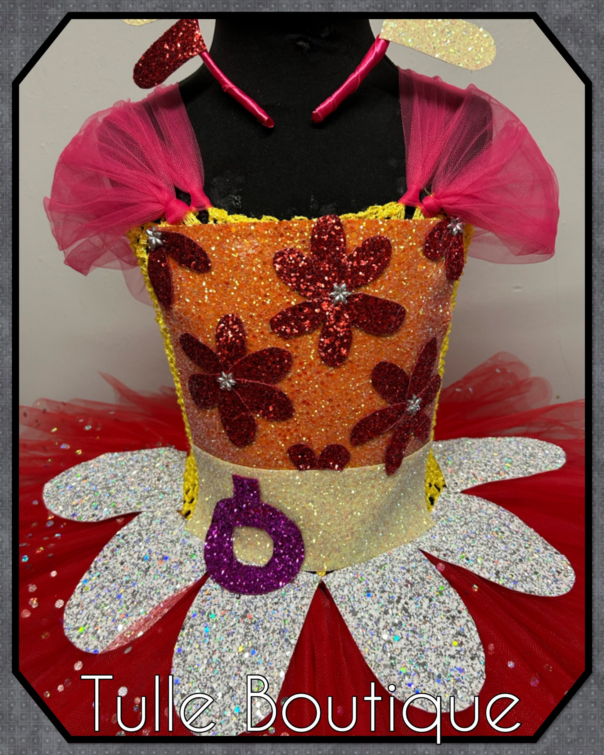 Featuring a glitter front with glitter flower detailing and petal shaped waist.