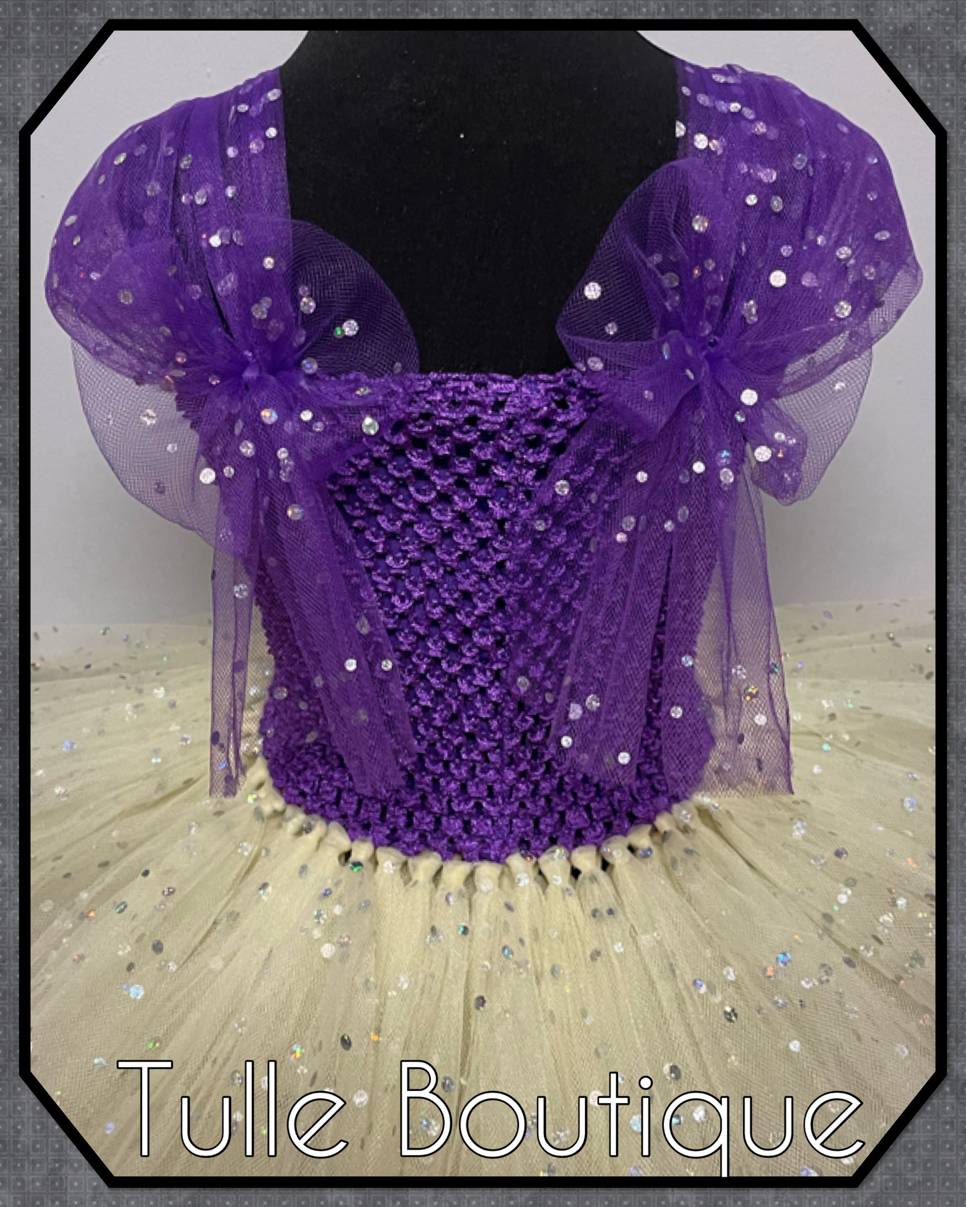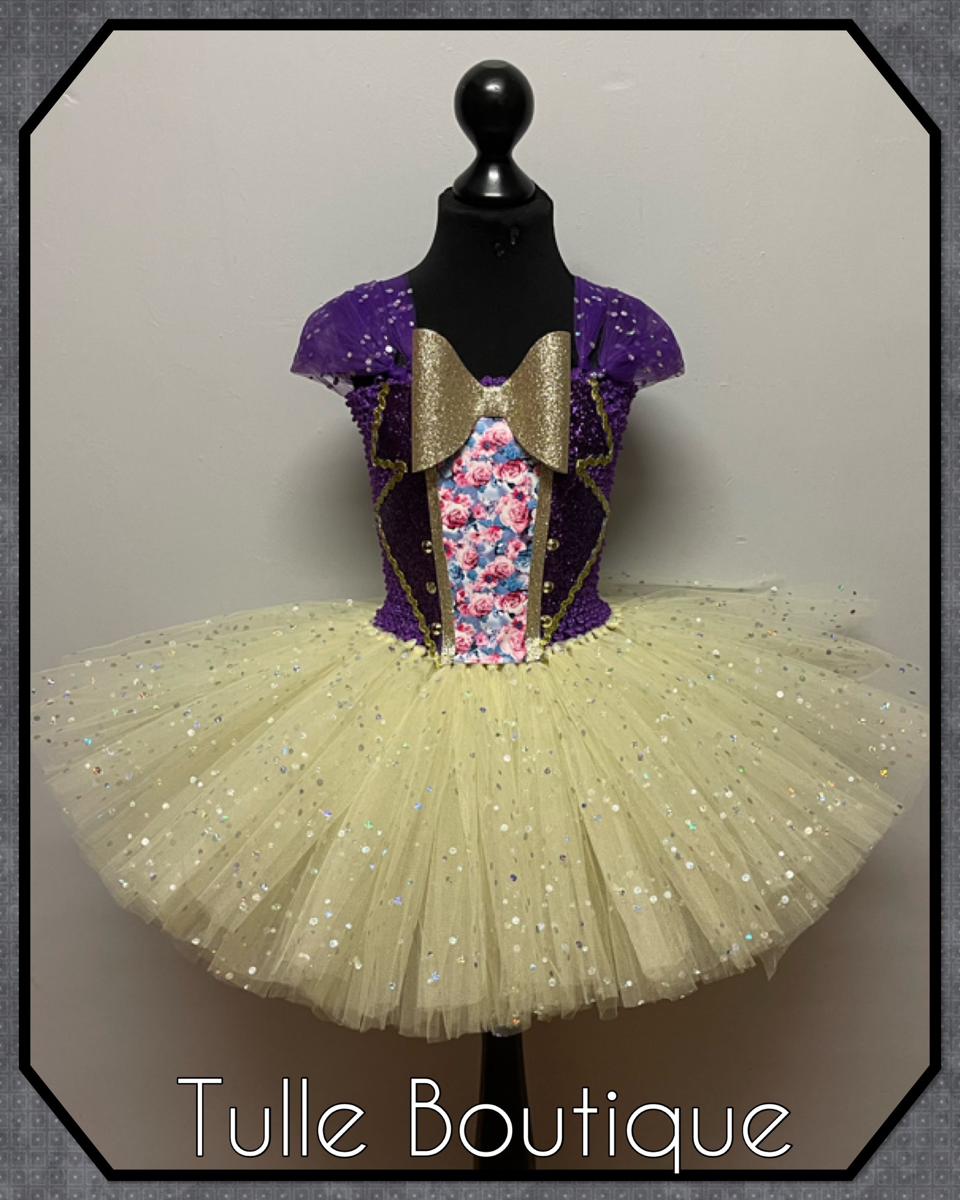 Featuring a glitter front with floral insert finished with button detail and oversized bow to the neckline. Can be made with the floral insert so the front is just purple glitter.